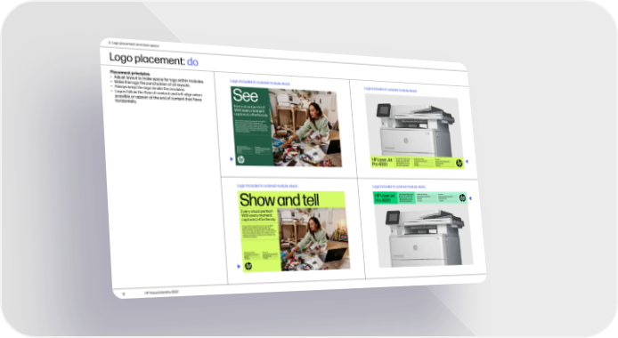 2. Logo placement and clear space Logo placement: do Placement principles Logo included in colored module stack. Logo included in colored module stack. • Adjust layout to make space for logo within modules. • Make the logo the punctuation of all layouts. • Always keep the logo inside the modules. • Logos follow the flow of content and left align when possible or appear at the end of content that flows horizontally. Logo included in colored module stack. Logo included in colored module stack. 12 HP Visual Identity 2022