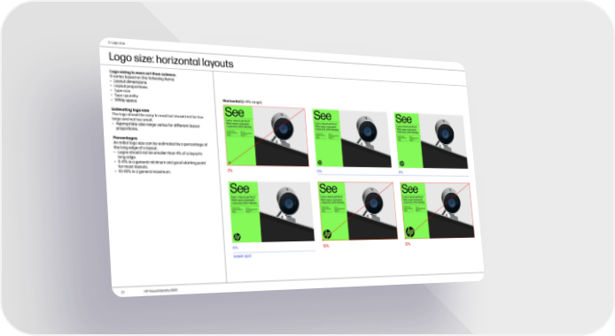 3. Logo size Logo size: horizontal layouts Logo sizing is more art than science. It varies based on the following items: • Layout dimensions • Layout proportions • Type size • Type quantity Horizontal (5–8% range) • White space Estimating logo size The logo should be easy to read but should not be too large and not too small. • Appropriate size range varies for different layout proportions. Percentages An initial logo size can be estimated by a percentage of the long edge of a layout. • Logos should not be smaller than 4% of a layout’s long edge. • 5–6% is a general minimum and good starting point for most layouts. 2% 5% 6% • 10–16% is a general maximum. 8% 10% 12% sweet spot 21 HP Visual Identity 2022