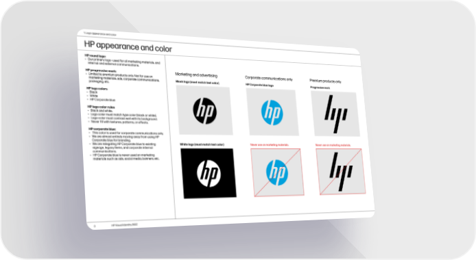 1. Logo appearance and color HP appearance and color HP round logo: • Our primary logo—used for all marketing materials, and internal and external communications. HP progressive mark: Marketing and advertising Corporate communications only Premium products only • Limited to premium products only. Not for use on marketing materials, ads, corporate communications, Black logo (must match text color) HP Corporate blue logo Progressive mark packaging, etc. HP logo colors • Black • White • HP Corporate blue HP logo color rules • Black and white. • Logo color must match type color (black or white). • Logo color must contrast well with its background. • Never fill with textures, patterns, or effects. HP corporate blue: • This color is used for corporate communications only. • We are almost entirely moving away from using HP Corporate blue for branding. • We are relegating HP Corporate blue to existing White logo (must match text color) Never use on marketing materials. Never use on marketing materials. signage, legacy items, and corporate internal communications. • HP Corporate blue is never used on marketing materials such as ads, social media, banners, etc. 3 HP Visual Identity 2022