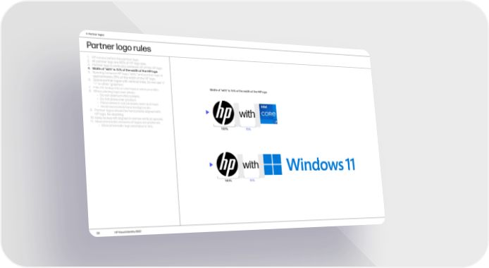 4. Partner logos Partner logo rules 1. HP comes before the partner logo. 2. All partner logo are 90% of HP logo size. 3. Partner logo is vertically centered off of the HP logo. 4. Width of “with” is 75% of the width of the HP logo. 5. Spacing between HP logo, “with,” and partner logo is approximately 25% of the width of the HP logo. 6. Space partner logos with vertical lines. Do not use “x” “—” or other “graphics.” Width of “with” is 75% of the width of the HP logo. 7. Film: Fit lockup into a ruled layout when possible. 8. When placing logo over photo: • Do not obstruct vital content. • Do not place over product. • Place where it can be easily seen and read. • Avoid excessively busy backgrounds. 9. Partner logos should be horizontally aligned with with HP logo. No stacking. 10. Keep lockup left aligned in narrow vertical spaces. 11. Monochromatic versions of logos are preferred. • Monochromatic logo examples in situ. 100% 75% with 100% 75% 39 HP Visual Identity 2022