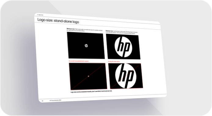 3. Logo size Logo size: stand-alone logo Minimum size: Quiet and poetic to match the tone of creative content Maximum size: Loud, present, and punchy. The large logo is intended (i.e. end card of an emotional film). to be felt and seen (i.e., end card of an energetic product demo). Too small: Unreadable/lost in space. Too big: No clear space. Logo size can be evaluated visually, don’t overthink it and trust your eye. 28 HP Visual Identity 2022