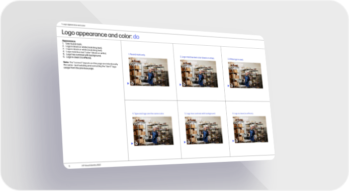 1. Logo appearance and color Logo appearance and color: do Appearance 1. Use round mark. 2. Logo is black or white (matching text). 3. Logo is black or white (matching text). 1. Round mark only. 2. Logo matches text color (black or white). 3. White logo is used. 4. Logo matches text “color” (black or white). 5. Logo has contrast with background. 6. Logo is clean (no effects). Note: The “correct” layouts on this page are intentionally the same—just isolating and correcting the “don’t” logo usage from the previous page. 4. Type and logo are the same color. 5. Logo has contrast with background. 6. Logo is clean (no effects). 5 HP Visual Identity 2022