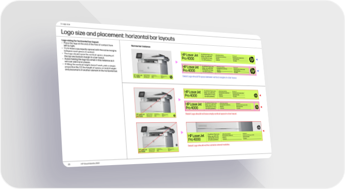 3. Logo size Logo size and placement: horizontal bar layouts Logo sizing for horizontal bar layout: Narrow bar instance • Place the logo at the end of the flow of content from left to right. • Try to have copy equally spaced with the same margins between each piece of content. • The logo should span the vertical space, stopping at the top and bottom margin in a bar layout. • Avoid making the logo too small in this instance as it will look weird and uneven. • If filling the vertical height doesn’t work, pick a simple proportion like 1/2 the height of space, or match height and placement of another element in the horizontal bar. Detail: Logo should fill space between vertical margins in a bar layout. Detail: Logo should not leave empty vertical space in a bar layout. Detail: Logo should not live outside colored modules. 26 HP Visual Identity 2022