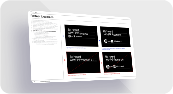 4. Partner logos Partner logo rules 1. HP comes before the partner logo. 2. All partner logo are 90% of HP logo size. 3. Partner logo is vertically centered off of the HP logo. 4. Width of “with” is 75% of the width of the HP logo. 5. Spacing between HP logo, “with,” and partner logo is approximately 25% of the width of the HP logo. 6. Space partner logos with vertical lines. Do not use “x” “—” or other “graphics.” 7. Film: Fit lockup into a ruled layout when possible. 8. When placing logo over photo: • Do not obstruct vital content. • Do not place over product. • Place where it can be easily seen and read. • Avoid excessively busy backgrounds. 9. Partner logos should be horizontally aligned with HP logo. No stacking. 10. Keep lockup left aligned in narrow vertical spaces. 11. Monochromatic versions of logos are preferred. • Monochromatic logo examples in situ. Logo is bigger than the cap height of the type. If scale is an issue, create negative space and drop the logos down to the last line. Don’t crowd lockup on same line with text. Don’t break the alignment/flow of layout. 42 HP Visual Identity 2022