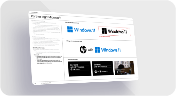 4. Partner logos Partner logo: Microsoft Individual partner pairing Only use blue Microsoft logo • The HP logo always comes first when paired with another brand. › The logo should be placed to the left in a horizontal layout, and if possible, above in a stacked layout. • Partner’s logo should never appear larger than the HP logo and usually should fall between 85%-90% of the HP logo it is being paired with. • Use the word “with” between the HP logo and the partner logo. Do not use the black logo. › “HP with [Partner]” Multiple parter pairings • When pairing the HP logo with multiple partner logos, only use the word “with” once and then separate each HP logo with blue Microsoft logo partner with a space and a vertical line. • Example: “HP with [Partner] | [Partner] | [Partner].” • A few current partners include but are not limited to: Intel, Google Chrome, Pfizer, and Microsoft. Specific partner rules All jumpstart and CCF guidelines must be adhered to. • Intel › The Intel logo needs to be 100% the same size as the HP logo. • Microsoft › Only use the blue Microsoft logo, never the black, in all instances (HP with Windows, Windows with HP, Mock-ups). End cards exception › The ONLY exception to this rule is end cards. On end cards the Microsoft logo can be either white or black depending on the usage. 35 HP Visual Identity 2022