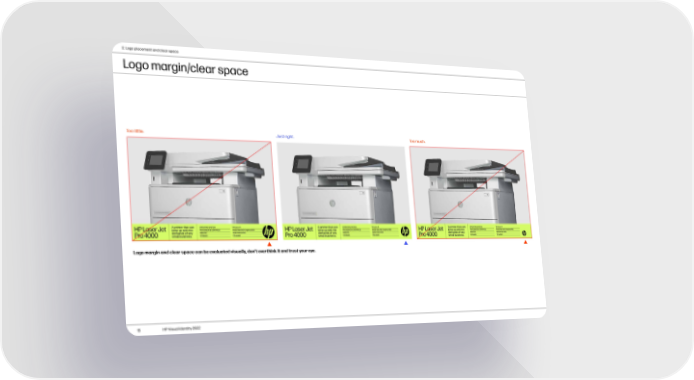 HP Brand Book Page 14 Page 162. Logo placement and clear space Logo margin/clear space Too little. Just right. Too much. Logo margin and clear space can be evaluated visually, don’t overthink it and trust your eye. 15 HP Visual Identity 2022