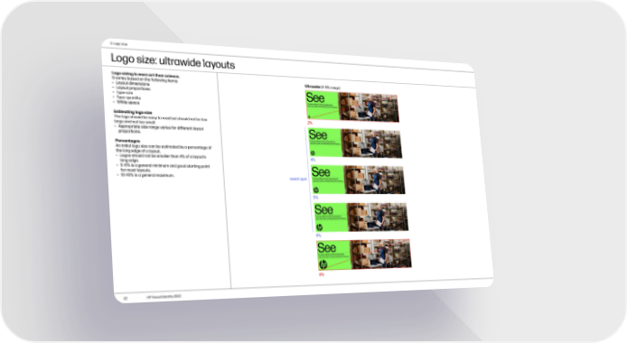 3. Logo size Logo size: ultrawide layouts Logo sizing is more art than science. Ultrawide (4–6% range) It varies based on the following items: • Layout dimensions • Layout proportions • Type size • Type quantity • White space Estimating logo size 2% The logo should be easy to read but should not be too large and not too small. • Appropriate size range varies for different layout proportions. Percentages An initial logo size can be estimated by a percentage of the long edge of a layout. • Logos should not be smaller than 4% of a layout’s 4% long edge. • 5–6% is a general minimum and good starting point for most layouts. • 10–16% is a general maximum. sweet spot 5% 6% 8% 22 HP Visual Identity 2022