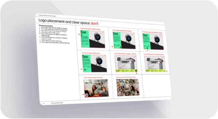 2. Logo placement and clear space Logo placement and clear space: don’t Placement principles 1. Don’t place logo in middle of layout. 2. Don’t align logo differently than text. 3. Don’t place logo in the middle of a margin. 1. Don’t insert logo into the middle of a layout. 2. Don’t right align logo under left-aligned text. 3. Don’t place logo in the middle of a margin. 4. Don’t float logo in white space. 5. Don’t fill the space too tightly or unevenly (logo too big). 6. Don’t fill the space too loosely or unevenly (logo too small). 7. Don’t obstruct product with logo. 8. Don’t obscure critical photo content with logo. 4. Don’t float logo in white space. 5. Don’t fill the space too tightly or unevenly. 6. Don’t fill the space too loosely or unevenly. 7. Don’t obstruct product with logo. 8. Don’t obscure critical photo content. 13 HP Visual Identity 2022
