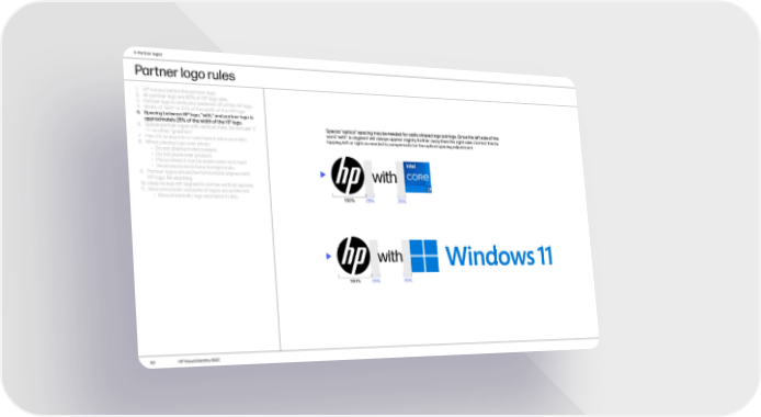 4. Partner logos Partner logo rules 1. HP comes before the partner logo. 2. All partner logo are 90% of HP logo size. 3. Partner logo is vertically centered off of the HP logo. 4. Width of “with” is 75% of the width of the HP logo. 5. Spacing between HP logo, “with,” and partner logo is approximately 25% of the width of the HP logo. Special “optical” spacing may be needed for oddly shaped logo pairings. Since the left side of the 6. Space partner logos with vertical lines. Do not use “x” word “with” is angled it will always appear slightly farther away then the right side. Correct this by “—” or other “graphics.” tapping left or right as needed to compensate for the optical spacing adjustment. 7. Film: Fit lockup into a ruled layout when possible. 8. When placing logo over photo: • Do not obstruct vital content. • Do not place over product. • Place where it can be easily seen and read. • Avoid excessively busy backgrounds. 9. Partner logos should be horizontally aligned with with HP logo. No stacking. 10. Keep lockup left aligned in narrow vertical spaces. 11. Monochromatic versions of logos are preferred. • Monochromatic logo examples in situ. 100% 25% 25% with 100% 25% 25% 40 HP Visual Identity 2022