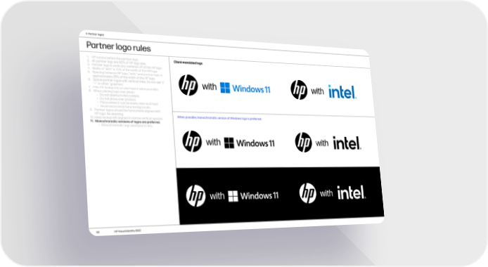 4. Partner logos Partner logo rules 1. HP comes before the partner logo. Client-mandated logo 2. All partner logo are 90% of HP logo size. 3. Partner logo is vertically centered off of the HP logo. 4. Width of “with” is 75% of the width of the HP logo. 5. Spacing between HP logo, “with,” and partner logo is approximately 25% of the width of the HP logo. 6. Space partner logos with vertical lines. Do not use “x” “—” or other “graphics.” with with 7. Film: Fit lockup into a ruled layout when possible. 8. When placing logo over photo: • Do not obstruct vital content. • Do not place over product. • Place where it can be easily seen and read. • Avoid excessively busy backgrounds. 9. Partner logos should be horizontally aligned with HP logo. No stacking. When possible, monochromatic version of Windows logo is preferred. 10. Keep lockup left aligned in narrow vertical spaces. 11. Monochromatic versions of logos are preferred. • Monochromatic logo examples in situ. with with with with 46 HP Visual Identity 2022