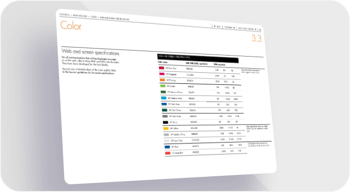contentS > how we Look > coLor > web and Screen SpecificationS back forward Skip to next chapter 32 Color 3.3 Web and screen specifications web and Screen SpecificationS for all communications that will be displayed on-screen Color name WEB SAFE (HEX) equivalent RGB equivalent or on the web, refer to these rGb and hex color formulas. they have been developed for the best fidelity. hp dark red 990000 153r 0G 0b type should be reversed to white against these colors. hp.com uses a limited subset of the color palette. refer hp Magenta cc0066 209r 1G 99b to the hp.com guidelines for the exact specifications. hp orange eb5f01 235r 95G 1b hp Green 4faf00 79r 175G 0b hp Medium Green 336633 51r 102G 51b hp Medium blue 0066ff 0r 102G 255b hp dark blue 003366 0r 35G 75b hp dark Green 336666 37r 68G 70b hp dark Gray 666666 132r 133G 137b hp black 000000 0r 0G 0b hp Yellow ffcc00 242r 171G 1b type should be black on these colors. do not reverse to white type. hp Medium Gray 999999 178r 179G 181b hp Light Gray cccccc 214r 215G 217b hp blue 0a357e 41r 86G 143b corporate colors should not be used as the dominant color. compaq red ff0000 210r 16G 51b