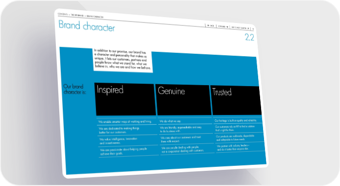 contentS > the hp brand > brand character back forward Skip to next chapter 5 Brand character 2.2 in addition to our promise, our brand has a character and personality that makes us unique. it lets our customers, partners and people know what we stand for, what we believe in, who we are and how we behave. Our brand Inspired Genuine Trusted character is: we enable smarter ways of working and living. we do what we say. our heritage is built on quality and reliability. we are dedicated to making things we are friendly, approachable and easy our customers rely on hp to find a solution better for our customers. to do business with. that’s right for them. we value intelligence, innovation we care about our customers and treat our products are well-made, dependable and inventiveness. them with respect. and adaptable to future needs. we are passionate about helping people we are people dealing with people, we partner with industry leaders— achieve their goals. not a corporation dealing with customers. and do it better than anyone else.