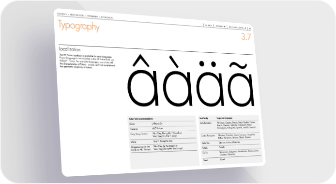 contentS > how we Look > typoGraphy > LocaLization back forward Skip to next chapter 64 Typography 3.7 Localization the hp futura typeface is available for most languages. if your language is not included in the hp futura font, use adobe® futura. for non-Latin languages, use a font with the characteristics of futura—a sans serif that complements the geometric simplicity of futura. âàäã asian font recommendations Font family Supported languages korea ui-reung-do indo-european afrikaans, catalan, danish, dutch, english, finnish, thailand abc pathom french, German, icelandic, indonesian, italian, norwegian, portuguese, Spanish, Swahili, Swedish hong kong, taiwan wen ding zhong hei ti (headline) wen ding chu hei ti (copy) central european albanian, croatian, czech, faeroese, hungarian, china han yi zhong hei Jian polish, romanian, Serbian, Slovak, Slovene baltic rim estonian, Latvian, Lithuanian Singapore (same font wen ding ta hei (headline) family as hk, taiwan) wen ding zhong hei (body copy) turkish turkish cyrillic belorussian, bulgarian, Macedonian, russian, Serbo- croatian, ukrainian Greek Greek