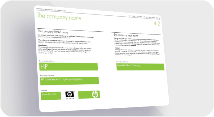 contentS > how we taLk > the coMpany naMe back forward Skip to next chapter 74 The company name 4.2 The company brand name The company trade name our company brand name is hp, regardless of the typeface in which it appears. it is registered the company trade name of the u.S. parent corporation remains hewlett-packard company, in most countries as a trademark and/or service mark. regardless of the typeface in which it appears. it is always used as a noun. while each when referring to our products and services, always use the company brand name as an subsidiary has its own company trade name (e.g., hewlett-packard Ltd. in the u.k.), the parent adjective—for example, hp computers, hp support services and hp LaserJet printers. and subsidiary companies are usually referred to simply as hewlett-packard. when we refer informally to the company, hp is preferred. Capitalization Treatment the company brand name must be written in uppercase and appear in the same typeface whenever the company trade name is used in text, the word “company” must be spelled as the rest of the text. the only time that hp will not be capitalized is when it appears in out in full; it may not be abbreviated. when used in editorial text, such as a press release, the hp.com urL, the hp invent logo and the Stretch—in these cases it should appear in the company name may be abbreviated to hewlett-packard or hp. it must appear in the same the lowercase as “hp.” typeface as the surrounding text. the company brand name: the company trade name: hp hewlett-packard company hp is always capitalized: hp is the leader in digital photography. exceptions: www.hp.com