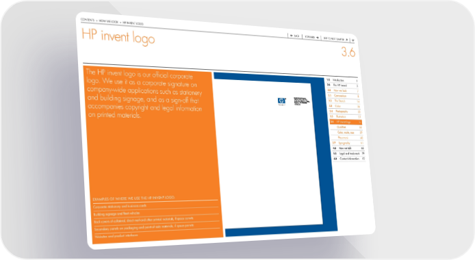 contentS > how we Look > hp inVent LoGo back forward Skip to next chapter 57 HP invent logo 3.6 .0 introduction 1 The HP invent logo is our official corporate .0 the hp brand 3 3.0 logo. We use it as a corporate signature on how we look 7 company-wide applications such as stationery 3. composition 8 3. the Stretch 14 3.3 color 28 and building signage, and as a sign-off that 3.4 photography 33 accompanies copyright and legal information 3.5 illustration 51 on printed materials. 3.6 hp invent logo 57 Qualities 58 color, scale, size 59 placement 60 3.7 typography 61 4.0 how we talk 68 5.0 Legal and trademark 79 6.0 contact information 82 exaMpLeS of where we uSe the hp inVent LoGo: corporate stationery and business cards building signage and fleet vehicles back covers of collateral, direct mail and other printed materials, if space permits Secondary panels on packaging and point-of-sale materials, if space permits websites and product interfaces