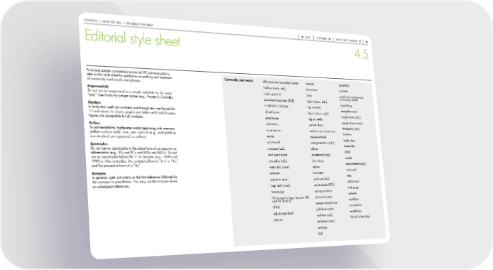 contentS > how we taLk > editoriaL StyLe Sheet back forward Skip to next chapter 7 Editorial style sheet 4.5 to ensure greater consistency across all hp communications, Commonly used words: refer to this style sheet for guidance on spelling and treatment all-in-one (not a product name) intranet scalability of commonly used words and phrases. backup (noun, adj.) know-how scalable ampersand (&) back up (verb) Linux small and medium-size do not use an ampersand as a simple substitute for the word business-to-business (b2b) log-in (noun, adj.) businesses (SMb) “and.” use it only for proper names (e.g., procter & Gamble). storytelling Numbers cd-roM, cd-roMs log in (verb) straightforward in body text, spell out numbers one through ten; use figures for client/server log-on (noun, adj.) 11 and above. in charts, graphs and tables with limited space, easy-to-use log on (verb) supply-chain (adj.) figures are acceptable for all numbers. supply chain (noun) Prefixes e-business market share third-party (adj.) to aid readability, hyphenate words beginning with common e-commerce medium-size businesses timeline prefixes such as multi-, non-, pre-, and co- (e.g., multi-platform, e-mail mission-critical non-standard, pre-approved, co-author). trade show apostrophes end-to-end next-generation (adj.) true-to-life do not use an apostrophe in the plural form of an acronym or end-user (adj.) offline unix abbreviation (e.g., pcs not pc’s and Skus not Sku’s). do not end user (noun) on-demand (adj.) use an apostrophe before the “s” in decades (e.g., 1990s not usable 1990’s). also remember, the contracted form of “it is” is “it’s,” everyday (adj.) one Voice user-centered (adj.) and the possessive form of is “its.” every day (noun) online acronyms extranet on-screen voicemail in general, spell out a term on the first reference, followed by web the acronym in parentheses. you may use the acronym alone high-tech (adj.) point-and-click web-based on subsequent references. high tech (noun) point-of-sale (poS) homepage pop-up window web page print-out (noun) website hp (except in logo, hp.com urL and the Stretch) process ease-of-use workflow htML pull-down menu workstation industry-standard real-time (adj.) world-class internet real time (noun) world wide web redesign roit