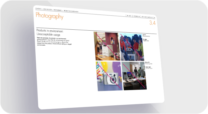 contentS > how we Look > photoGraphy > productS in enVironMent back forward Skip to next chapter 4 Photography 3.4 Products in environment: Top left: busy environment Unacceptable usage Top right: Staged scene here are examples of products in an environment photographed in ways that do not represent our brand. photos should not use excessive props or objects that distract from the product. avoid artificial settings or staged environments. bottom left: distracting props bottom right: irrelevant action