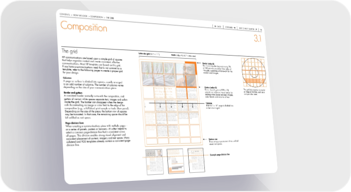 contentS > how we Look > coMpoSition > the Grid back forward Skip to next chapter 0 Composition 3.1 The grid Letter-size grid (8.5” x 11”) Width (value w; 8.5” in this case) hp communications are based upon a simple grid of squares border (value b) that helps organize content and create consistent, effective the ¼-inch border (approximately 3% communications. Most hp templates are based on this grid. of w) extends around all four sides of if you have a communications need that is not covered by a this grid, supplying a framework for the template, refer to the following pages to create a proper grid content and images. for your design. Columns a page or surface is divided into squares, usually arranged in an odd number of columns. the number of columns varies nibh euismod tincidunt ut laoreet dolore magna aliquam Gutters (value G) the grid also applies to circular headline 22pt here erat volutpat. Veniam, quis nostrud exerci tation ullamcor- 1 these / -inch gutters (50% of b) depending on the size of your communications piece. per suscipit lobortis nisl ut aliquip ex ea commodo conse- 8 or irregular formats, such as a with big idea in the quat. duis autem vel eum iriure dolor. provide an important visual pause by compact disc label. border and gutters dominant color—in in hendrerit in vulputate velit esse molestie consequat, adding white space between images, wisi enim ad minim veniam, quis nostrud exerci tation ullamcorper suscipit lobortis nisl ut aliquip e commodo color blocks and columns of text. a consistent border normally surrounds the composition, and this case pMS 152cv. consequat. duis autem vel eum iriure dolor in hendrerit e in vulputate velit esse. Viritus adeso perche tutiie. gutters of narrow white spaces separate text, images and colors body text can discuss market needs and customer Headline pt problems, describe a strategic initiative, product, service nulla facilisis at vero eros et accumsan et iusto odio dig- inside the grid. the border can disappear when the design or solution, touch on key features and benefits, price/ nissim qui blandit praesent luptatum zzril delenit augue Columns performance, tco and roi, and point out the key duis dolore te feugait nulla facilisi. Lorem ipsum dolor sit calls for extending an image or color field to the edge of the differentiators of our product/service/solution/strategy amet, consectetuer adipiscing elit, sed diam nonummy this 8.5” x 11” page is divided into (why it’s better than our competitors’ offering). if you nibh euismod tincidunt ut laoreet dolore magna aliquam composition (e.g., a full-bleed print sample or trade show panel). are creating the original piece in english, always allow erat volutpat. at vero eos et accusam et justo duo dolores a five-column grid. a minimum of 30% extra space for expansion with et ea rebum. Stet clita kasd gubergren. depending on the size of the piece, the bottom row of squares language translation. (9 pt) Lorum ipsum illius aperto. “pull quote contains duis autem vel eum iriure dolor in hendrerit in vulputate ut wisi enim ad minim veniam, quis nostrud exerci tation velit esse molestie consequat, vel illum dolore eu feugiat ullamcorper suscipit lobortis nisl ut aliquip exna aliquam may be truncated. in that case, the remaining space should be a customer quote, erat volutpat. ut wisi enim ad minim veniam, quis nostrud nulla facilisis at vero eros et accumsan velit esse molestie selling point or key consequat, vel illum dolore eu feugiat nulla facilisis at exerci tation ullamcorper suscipit lobortis nisl ut aliquip left unfilled as rest space. customer benefit vero erodio dignissim qui blandit praesent lumet, con- ex ea commodo quat. duis autem vel eum iriure dolor and appears in the sectetuer adipiscing elit, sed diam nonummy nibh euis- invulputate velit esse molestie conseq. dominant color. mod tincidunt ut laoreet dolore magnai blandit praesen. Page-division lines this block of copy headline 14pt when creating a communications piece with multiple pages— should be no longer Veniam, quis nostrud exerci tation ullamcorper suscipit than 427 characters lobortis nisl ut aliquip ex ea commodo consequat. duis or a series of panels, posters or banners—it’s often helpful to in length.” John Doe, autem vel eum iriure dolor in hendrerit in vulputate velit Account Manager esse molestie consequat, vel illum dolore eu feugiat nulla facilisis at villum dolore eu feugiat nulla facilisis at vero select a common page-division line that is consistent across eros et accumsan et iusto odio dignissim qui blandit praesent luptatum zzril delenit augue duis te feugait— all pages. this division enables strong visual alignment and fruis autem vel eum iriure dolor nulla. Lorem ipsum dolor consistent placement of content, imagery and rest space. Many sit amet, consectetuer adipiscing elit, sed diam nonummy collateral and poS templates already contain a consistent page- bottom row division line. 4 these empty squares are left as unfilled visual rest space. Messaging text 22pt contains a big idea, key Chart text header differentiators or customer quote. text is in the chart text describes chart contents. dominant color. Lorem ipsum dolor sit amet, Chart text header w/rule disk array capacity type function xp48 8.7 tb 18 Gb 15k rpm fc disks and 73 Gb 10k rpm fc disks open xp128 9.3 tb 36 Gb 15k rpm fc disks and 73 Gb 10k rpm fc disks n/a consectetuer adipiscing elit, sed diam nonummy xp512 92.6 tb 18 Gb 15k rpm fc disks and 73 Gb 10k rpm fc disks closed xp7124 92.6 tb 48 Gb 15k rpm fc disks and 73 Gb 10k rpm fc disk n/a nibh euismod tincidunt ut laoreet dolore magna HP Product name hp Surestore business copy xp hp Surestore direct backup engine tL aliquam erat volutpat. ut wisi enim ad minim. hp Surestore gigabite fun drive 2.0 HP Product name Servers workgroup Midrange high-end operating system firewall hp-ux n/a a-, d-, J-, L-class n-, V-class hp-ux 11.x hp 123.1 nibh euismod tincidunt ut laore