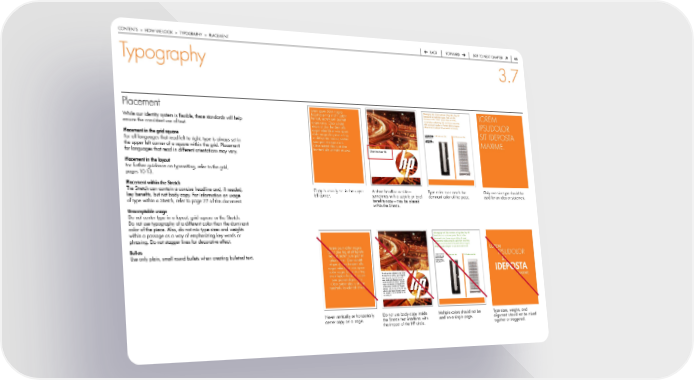 contentS > how we Look > typoGraphy > pLaceMent back forward Skip to next chapter 65 Typography 3.7 Lorem ipsum dolor magna Messaging text 22pt contains a big idea, key dif- Messaging text 22pt contains a big idea, key dif- Placement ferentiators or customer quote. Text is in the ferentiators or customer quote. Text is in the LOREM facipit atue ting et alit luptatin dominant color. Lorem ipsum dolor sit amet, dominant color. Lorem ipsum dolor sit amet, henissit, sectem sum quamet consectetuer adipiscing elit, sed diam nonummy consectetuer adipiscing elit, sed diam nonummy while our identity system is flexible, these standards will help nibh euismod tincidunt ut laoreet dolore magna nibh euismod tincidunt ut laoreet dolore magna aliquis cinisi. Obor autatet aliquam erat volutpat. Ut wisi enim ad minim. aliquam erat volutpat. Ut wisi enim ad minim. IPSUDOLOR ensure the consistent use of text. eliquis at dion hendreril ulla augait velenibh et wissi ipsum 1. Callout describes product feature 1. HP Product name 14pt 2. HP Product name 14pt 1. Callout describes product feature 1. HP Product name 14pt 2. HP Product name 14pt or benefit. Lorum ipsom vero quorio or benefit. Lorum ipsom vero quorio qui blandit praesent lumet, con itu qui blandit praesent lumet, con itu SIT IDEPOSTA setuer adipisci elit pirum ellius tilum setuer adipisci elit pirum ellius tilum dolor magna facipit atue ting ipus lorum ipsus etal vergamo. ipus lorum ipsus etal vergamo. 2. Ais pretosius rures lucide 2. Ais pretosius rures lucide corrumperet vix verecundus catelli. corrumperet vix verecundus catelli. Placement in the grid square et alit luptatin henissit, sectem Agricolae suffragarit catelli—Cathe- Agricolae suffragarit catelli—Cathe- dras divinus fermentet. dras divinus fermentet. MAxIME. for all languages that read left to right, type is always set in sum quamet aliquis cinisi. the upper left corner of a square within the grid. placement Obor autatet eliquis at dion hendreril ulla velenibh et wissi. Short brochure title for languages that read in different orientations may vary. Placement in the layout for further guidance on typesetting, refer to the grid, pages 10-13. Placement within the Stretch the Stretch can contain a concise headline and, if needed, copy is usually set in the upper a short headline or title— type color must match the only one size type should be key benefits, but not body copy. for information on usage left corner. sometimes with a subtitle or brief dominant color of the piece. used for an idea or statement. of type within a Stretch, refer to page 22 of this document. benefits copy—may be placed within the Stretch. unacceptable usage do not center type in a layout, grid square or the Stretch. do not use typography of a different color than the dominant color of the piece. also, do not mix type sizes and weights Messaging text 22pt contains a big idea, key dif- Messaging text 22pt contains a big idea, key dif- within a passage as a way of emphasizing key words or ferentiators or customer quote. Text is in the ferentiators or customer quote. Text is in the dominant color. Lorem ipsum dolor sit amet, dominant color. Lorem ipsum dolor sit amet, phrasing. do not stagger lines for decorative effect. consectetuer adipiscing elit, sed diam nonummy consectetuer adipiscing elit, sed diam nonummy nibh euismod tincidunt ut laoreet dolore magna nibh euismod tincidunt ut laoreet dolore magna Lorem ipsum dolor magna aliquam erat volutpat. Ut wisi enim ad minim. aliquam erat volutpat. Ut wisi enim ad minim. LoreM bullets facipit atue ting et alit luptatin 1. Callout describes product feature 1. HP Product name 14pt 2. HP Product name 14pt 1. Callout describes product feature 1. HP Product name 14pt 2. HP Product name 14pt IPSUDOLOR henissit, sectem sum quamet or benefit. Lorum ipsom vero quorio or benefit. Lorum ipsom vero quorio use only plain, small round bullets when creating bulleted text. qui blandit praesent lumet, con itu qui blandit praesent lumet, con itu setuer adipisci elit pirum ellius tilum setuer adipisci elit pirum ellius tilum aliquis cinisi. Obor autatet ipus lorum ipsus etal vergamo. ipus lorum ipsus etal vergamo. 2. Ais pretosius rures lucide 2. Ais pretosius rures lucide corrumperet vix verecundus catelli. corrumperet vix verecundus catelli. Sit Agricolae suffragarit catelli—Cathe- Agricolae suffragarit catelli—Cathe- eliquis at dion hendreril ulla dras divinus fermentet. dras divinus fermentet. augait velenibh et wissi ipsum IDEPOSTa dolor magna facipit atue ting et alit luptatin henissit, sectem to odiam delis nulluptat ut nim volor- er ostrud enim nullam, quisit dignibh MaxiMe. sum quamet aliquis cinisi. exer sustis alit, quis nim nonsenis num velesto dunt laorpero corer si. Obor autatet eliquis at dion cipissi smodit lute ming er sendipit augiat dolorerosto odoluptat dolor hendreril ulla velenibh et wissi. iril exerostrud te tatem at. feugait, vel utem vulla faccum nit lor sim ipit, vel iril erilisit laore doloreet niamet nos auguer si tatum vel utet wis nis accummy no never vertically or horizontally do not use body copy inside Multiple colors should not be type sizes, weights, and center copy on a page. the Stretch that interferes with used on a single page. alignment should not be mixed the impact of the hp circle. together or staggered.