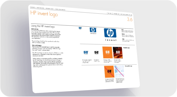 contentS > how we Look > hp inVent LoGo > coLor, ScaLe and Size back forward Skip to next chapter 5 HP invent logo 3.6 Using the HP invent logo Small Minimum width of .375” (9.5mm) Maximum width of 1" (25.4mm) Scale and size to communicate effectively while maintaining the integrity Medium of our identity, three standard sizes of the hp invent logo Minimum width of 1” (25.4mm) have been created: small, medium and large. use the size Maximum width of 6” (152.4mm) appropriate for the communications piece to ensure that Large the registration mark (®) is in the correct proportion for Minimum width of 6” (152.4mm) your application. no maximum width the invent logo should not be reproduced smaller than .375” or 9.5mm in width. Color and imagery acceptable usage the two-color hp corporate logo is used for corporate stationery, business cards and signage. within this logo, the word “invent” is always black. the hp invent logo can also be shown in all black on a white background, or reversed to white when shown against a dominant color field. when used as a corporate sign-off on marketing materials, the hp invent logo can also be placed over an image or the two-color corporate the one-color the logo in white the logo in white illustration. however, there must be sufficient contrast for logo, with “invent” corporate logo reversed out against a reversed out against clear legibility. be mindful of the placement of the hp invent always in black dominant color a photograph logo near a photograph of a person’s face or over a busy, distracting photo. unacceptable usage the logo should not be the logo should not be shown in black against shown in white against a dominant color field. a photo that lacks sufficient contrast.