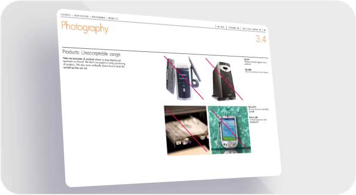 contentS > how we Look > photoGraphy > productS back forward Skip to next chapter 3 Photography 3.4 Products: Unacceptable usage Top left: products jumbled together like a sculpture here are examples of products shown in ways that do not represent our brand. we don’t use playful or tricky positioning Top right: of products. we also never artificially distort them to look like distorted perspective from below something they are not. bottom left: blurred, distorted and oddly colored bottom right: artificial placement and background