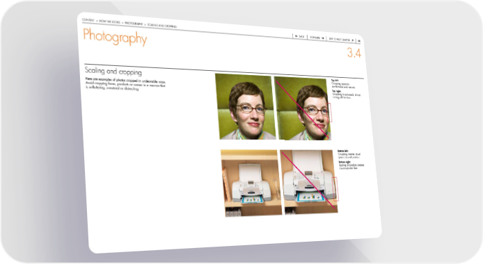 content > how we LookS > photoGraphy > ScaLinG and croppinG back forward Skip to next chapter 4 Photography 3.4 Scaling and cropping Top left: cropping appears comfortable and natural. here are examples of photos cropped in undesirable ways. Top right: avoid cropping faces, products or scenes in a manner that cropping is awkward, almost is unflattering, unnatural or distracting. cutting off the face. bottom left: cropping creates visual space around product. bottom right: Scaling of product creates claustrophobic feel.