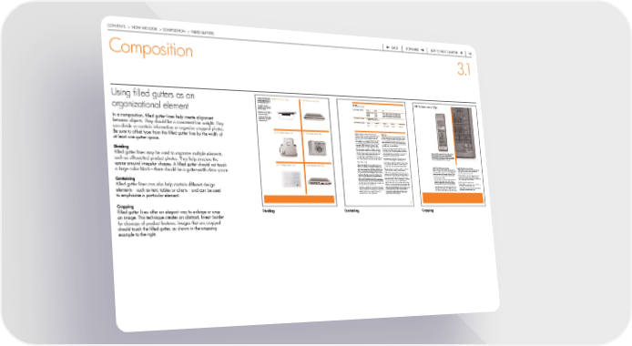 contentS > how we Look > coMpoSition > fiLLed GutterS back forward Skip to next chapter 3 Composition 3.1 1. Callout describes product feature HP Product name 14pt 2. HP Product name 14pt or benefit. Lorum ipsom vero quorio HP Product name 22pt Using filled gutters as an qui blandit praesent lumet, con itu Chart header setuer adipisci elit pirum ellius tilum Chart text describes chart contents. ipus lorum ipsus etal vergamo. 2. Ais pretosius rures lucide Chart text header (1.25pt rule) Chart text Capacity Type corrumperet vix verecundus catelli. Agricolae suffragarit catelli—Cathe- Chart header (0.5pt) 8.7 TB 18 GB 15k rpm FC disks and 73 GB 10k rpm FC disks dras divinus fermentet. Chart text 9.3 TB 36 GB 15k rpm FC disks and 73 GB 10k rpm FC disks Chart text 92.6 TB 18 GB 15k rpm FC disks and 73 GB 10k rpm FC disks organizational element 3. Ais pretosius rures lucide etali Chart text 92.6 TB 48 GB 15k rpm FC disks and 73 GB 10k rpm FC disks rumperet vix verecundus catelli and the Agricolae per adesoon. Chart text header (1.25pt rule) HP Surestore Business Copy XP HP Surestore Direct Backup Engine TL 4. Octavius, iam fiducia suis etus deciperet incret incret incredibiliter lascivius zothecas. Aquae Sulis Chart text header (1.25pt rule) Servers Workgroup Midrange High-end Operating system in a composition, filled gutter lines help create alignment conubium lorum ipsum. HP-UX n/a A-, D-, J-, L-class N-, V-class HP-UX 11.x between objects. they should be a consistent line weight. they can divide or contain information or organize cropped photos. Body text can discuss market needs and customer Headline 9pt 3. HP Product name 14pt 4. HP Product name 14pt problems, describe a strategic initiative, product, service Nulla facilisis at vero eros et accumsan et iusto odio dig- or solution, touch on key features and benefits, price/ nissim qui blandit praesent luptatum abril delenit augue be sure to offset type from the filled gutter line by the width of performance, TCO and ROI, and point out the key duis dolore te feugait nulla facilisi. Lorem ipsum dolor sit differentiators of our product/service/solution/strategy amet, consectetuer adipiscing elit, sed diam nonummy (why it’s better than our competitors’ offering). If you nibh euismod tincidunt ut laoreet dolore magna aliquam at least one gutter space. are creating the original piece in English, always allow erat volutpat. At vero eos et accusam et justo duo dolores a minimum of 30% extra space for expansion with et ea rebum. Stet clita kasd gubergren. language translation. (9 pt) Lorum ipsum illius aperto. Ut wisi enim ad minim veniam, quis nostrud exerci tation Duis autem vel eum iriure dolor in hendrerit in vulputate ullamcorper suscipit lobortis nisl ut aliquip exna aliquam velit esse molestie consequat, vel illum dolore eu feugiat erat volutpat. Ut wisi enim ad minim veniam, quis nostrud nulla facilisis at vero eros et accumsan velit esse molestie exerci tation ullamcorper suscipit lobortis nisl ut aliquip ex Callout header Callout describes product features, details or other infor- Dividing consequat, vel illum dolore eu feugiat nulla facilisis at ea commodo quat. Duis autem vel eum iriure dolor mation. Lorem ipsum dolor sit amet, consectetuer adipiscing elit, sed diam non ummy nibh euismod tincidunt ut laoreet dolore magna vero erodio dignissim qui blandit praesent lumet, invulputate velit esse molestie conseq. aliquam erat volutpat. Ut wisi enim ad minim veniam, quis nostrud exer- consectetuer adipiscing elit, sed diam nonummy nibh euis- ci tation ulla mcorper suscipit lobortis nisl ut aliquip. Lorem ipsum dolor filled gutter lines may be used to organize multiple elements, mod tincidunt ut laoreet dolore magnai blandit praesen. •Bullets provide an opportunity to highlight important sit amet, consectetuer adipiscing elit. Perche e cosi adesso. pieces of information (9 pt). Lorum ipsum etalis. such as silhouetted product photos. they help structure the Headline 14pt •Bullets have an indent that is created in Quark by using Veniam, quis nostrud exerci tation ullamcorper suscipit the Command + back slash key. The tab is created in 5. HP Product name 14pt 6. HP Product name 14pt lobortis nisl ut aliquip ex ea commodo consequat. Duis the Bullets style sheet. Ipsumit lorimis epitalia adeso. Headline 9pt identifies product benefits. Headline 9pt identifies product benefits. space around irregular shapes. a filled gutter should not touch autem vel eum iriure dolor in hendrerit in vulputate velit •Duis autem vel eum iriure dolor in hendrerit in vulputate Body text describes product benefits and can touch on •Indented bullets are used to describe product features esse molestie consequat, vel illum dolore eu feugiat nulla velit esse molestie consequat. Per tutoilis apertos. features. It is 9 point size. If you are creating the original and support the headline above. (9pt) Highlight facilisis at villum dolore eu feugiat nulla facilisis at vero Bel illum dolore eu feugiat nulla facilisis at vero eros et piece in English, always allow a minimum of 30% extra features that differentiate the product. a large color block—there should be a gutter-width clear space. eros et accumsan et iusto odio dignissim qui blandit prae- accumsan et iusto odio dignissim qui blandit praesent lup- space for expansion with language translation. Lorem sent luptatum abril delenit augue duis te feugait—fruis ipsum dolor nibh euismod tincidunt ut laoreet dolore •Indented bullets are used to describe product features autem vel eum iriure dolor nulla. Lorem ipsum dolor sit tatum abril delenit augue duis dolore te feugait. At vero magna. Lorum ipsum etalius. and support the headline above. (9pt) Lorem ipsum amet, consectetuer adipiscing elit, sed diam nonummy eos et accusam et justo duo dolores et ea rebum. Lorem dolor sit amet, consetetur sadipscing elitr, sed diam non- nibh euismod tincidunt ut laoreet dolore magna aliquam ipsum dolor sit amet, consetetur sa