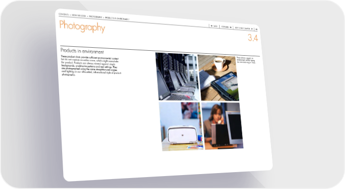 contentS > how we Look > photoGraphy > productS in enVironMent back forward Skip to next chapter 40 Photography 3.4 Products in environment these photos suggest an environment without being too overwhelming or literal. these product shots provide sufficient envrionmental context but do not capture an entire scene, which might overwhelm the product. products are always viewed against simple backgrounds, unobtrusive patterns and real settings. they are photographed using the same straightforward angles and lighting as our silhouetted, informational style of product photography.