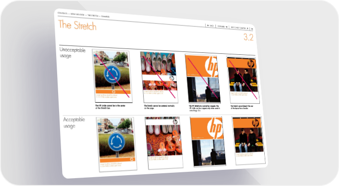 contentS > how we Look > the Stretch > exaMpLeS back forward Skip to next chapter 4 The Stretch 3.2 Unacceptable usage Short headline or title Longer headlines should be placed Longer headlines should be placed in color fields or other open areas in color fields or other open areas Longer headlines should be placed in color fields or other open areas The HP circle cannot be in the center The Stretch cannot be centered vertically The HP letterforms cannot be cropped. The The Stretch cannot bleed if the rest of the Stretch bar. on the page. HP circle can be cropped only when used in of the layout has a border. extra-large size. Acceptable usage Short headline or title Longer headlines should be placed Longer headlines should be placed in color fields or other open areas in color fields or other open areas Longer headlines should be placed in color fields or other open areas