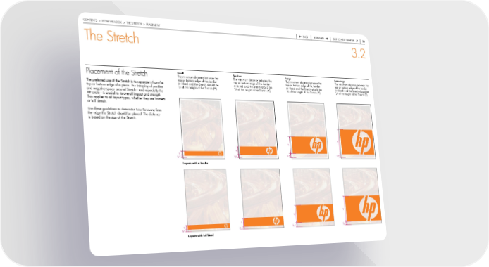 contentS > how we Look > the Stretch > pLaceMent back forward Skip to next chapter 0 The Stretch 3.2 Placement of the Stretch Small Medium Large Extra-large the minimum distance between the the minimum distance between the the minimum distance between the the minimum distance between the top or bottom edge of the border top or bottom edge of the border top or bottom edge of the border top or bottom edge of the border the preferred use of the Stretch is to separate it from the or bleed and the Stretch should be or bleed and the Stretch should be or bleed and the Stretch should be or bleed and the Stretch should be 1 3 1 4 1 8 top or bottom edge of a piece. the interplay of positive ½ of the height of the Stretch (y). / of the height of the Stretch (y). / of the height of the Stretch (y). / of the height of the Stretch (y). and negative space around Stretch—and especially the hp circle—is crucial to its overall impact and strength. this applies to all layout types, whether they use borders or full bleeds. use these guidelines to determine how far away from the edge the Stretch should be placed. the distance is based on the size of the Stretch. y y y y 1 ¼y 1 /y ½y /y 8 3 Layouts with a border y y y y 1 ¼y 1 /y ½y /y 8 3 Layouts with full bleed