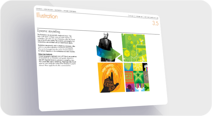 contentS > how we Look > iLLuStration > dynaMic StoryteLLinG back forward Skip to next chapter 5 Illustration 3.5 0RdS`bWaS[S\b CVS24>O\R Dynamic storytelling 28>]T5SR4f the illustrations we use are bold, simple and iconic. they 7]ab9]V\6OZZO\b O`S[SSbW\U help us tell stories in deeper ways and stand out from our competitors. the colors we use in illustrations reflect the vibrant ]\5`SRB[WbVO\R28>A]P2O`bS`0ZWdS W\bS`OQbWdSFSPSdS\b[OUOhW\S BWU\c^\]eObV^Q][U]QVO\USO`bWaba