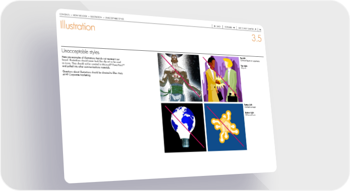 contentS > how we Look > iLLuStration > unacceptabLe StyLeS back forward Skip to next chapter 56 Illustration 3.5 Unacceptable styles Top left: cartoon figure or superhero here are examples of illustrations that do not represent our Top right: brand. illustrations should never look like clip art or be used clip art as icons. they should not be created in Microsoft® powerpoint™ and pulled into other communications materials. Questions about illustrations should be directed to ellen Maly at hp corporate Marketing. technohome2 technohome2 black & white white on background bottom left: clichéd concept bottom right: off-brand icon technohome2 technohome2 multi-color 2 color
