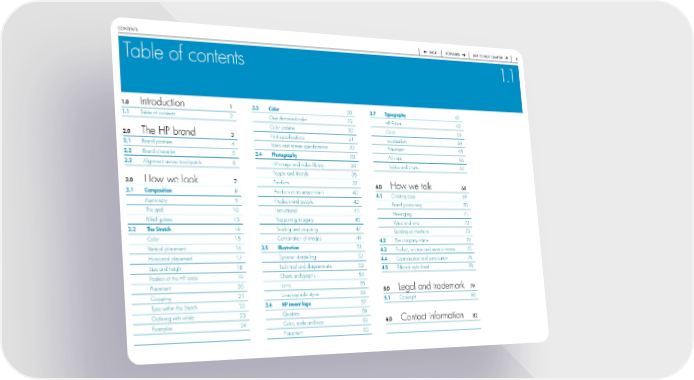 contentS back forward Skip to next chapter Table of contents 1.1 .0 Introduction 1 3.3 Color 28 3.7 Typography 61 . Table of contents 2 One dominant color 29 HP Futura 62 Color palette 30 Color 63 .0 The HP brand 3 Print specifications 31 Localization 64 . Brand promise 4 Web and screen specifications 32 Placement 65 . Brand character 5 3.4 Photography 33 All caps 66 .3 Alignment across touchpoints 6 HP image and video library 34 Tables and charts 67 People and lifestyle 35 3.0 How we look 7 Products 37 4.0 How we talk 68 3. Composition 8 Products in an environment 40 4. Creating copy 69 Asymmetry 9 Products and people 42 Brand positioning 70 The grid 10 Instructional 44 Messaging 71 Filled gutters 13 Supporting imagery 45 Voice and tone 72 3. The Stretch 14 Scaling and cropping 47 Building connections 73 Color 15 Combination of images 49 4. The company name 74 Vertical placement 16 3.5 Illustration 51 4.3 Product, solution and service names 75 Horizontal placement 17 Dynamic storytelling 52 4.4 Capitalization and punctuation 76 Size and height 18 Technical and diagrammatic 53 4.5 Editorial style sheet 78 Position of the HP circle 19 Charts and graphs 54 Placement 20 Icons 55 5.0 Legal and trademark 79 Cropping 21 Unacceptable styles 56 Type within the Stretch 22 3.6 HP invent logo 57 5. Copyright 80 Outlining with white 23 Qualities 58 6.0 Contact information 82 Examples 24 Color, scale and size 59 Placement 60