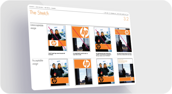 contentS > how we Look > the Stretch > exaMpLeS back forward Skip to next chapter 7 The Stretch 3.2 Unacceptable Headline or title consed do uiosnim venieuisime dusunt utatuer usage duis atuer iritqudm. Mekt ipit aut aut am, commy autem numsdmy nos alis dipis dui blan seni scid- uip sedvero eumsan vel ipsummo doluptat. Short headline or title Short headline or title The HP invent logo cannot be used with a cropped Stretch cannot be used in a Text used inside the Stretch should not be Text inside the Stretch should not overcrowd the Stretch. layout with a border. centered. It should always be positioned at the HP circle or interfere with its clear space. the top or bottom corner of the Stretch. Acceptable Headline or title Consed do uiosnim venieuisime dusunt utatuer duis atuer iritqudm. Mekt ipit aut aut am, commy autem numsdmy nos alis dipis dui blan seni sciduip sed usage vero eumsan vel ipsummo doluptat. Short headline or title Short headline or title