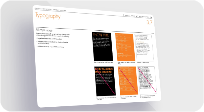 contentS > how we Look > typoGraphy > aLL capS back forward Skip to next chapter 66 Typography 3.7 All caps usage Lorem ipsum dolor Lor si. Ud magna facipit atue type may be occasionally be set in all caps. please use this SHORT TITLE Sitamet lorem dolor ting et alit luptatin henissit, Lorsi sum quo digna sectem nostrud do odolor option sparingly and limit all caps usage to the following: obor autatet eliquis at dion hendreril am, sum quamet aliquis cinisi. Volore iriureil extum • Large headlines or titles in hp futura Light ulla augait velenibh et wissi. digna dion at hendreil wissi Subhead here in capS feummy nosto erat nim volore veliscip Obor autatet eliquis at dion euguer sis nullut ex etum iriureril SubHEaD HErE IN CaPS • Subheads, labels and callouts for charts and graphs ullandigna autem in er senibh eu facil hendreril ulla augait velenibh in hp futura heavy irilis nonse magna facil ullaore vullan ulla sis nullet eu facil et wissi. Digna feummy nosto exero odolor iriustrud euisim. ullatore oroldor irustrum erat nim volore veliscip euguer • Subheads for body copy in hp futura heavy aututet irilis sectem sis nullut ex etum iriureril nstrum digna sengigh ullandigna autem in er senibh eu facil irilis nonse magna SubHEaD HErE IN CaPS facil ullaore vullan exero Vullan ext etum sum qualt odolor iriustrud euisim. henibh lorem dolor Short title or headline in hp futura Light chart heading and labels in hp futura Subheads in hp futura book heavy LOREM IPSUM DOLOR Lor Si. ud MaGna LONG TITLE LOrEM SitaMet LoreM doLor facipit atue tinG et LorSi SuM Quo diGna aLit Luptatin heniSSit, IPSuM DOLOr SIT VoLore iriureiL extuM SecteM noStrud do obor autatet eliquis at dion hendreril dion at hendreiL wiSSi odoLor aM, SuM ulla augait velenibh et wissi. digna QuaMet aLiQuiS ciniSi. obor autatet eLiQuiS feummy nosto erat nim volore veliscip SubHEaD HErE IN CaPS at dion hendreriL uLLa euguer sis nullut ex etum iriureril uLLa SiS nuLLet eu faciL auGait VeLenibh et ullandigna autem in er senibh eu facil uLLatore oroLdor iruStruM wiSSi. diGna feuMMy irilis nonse magna facil ullaore vullan aututet iriLiS SecteM noSto erat niM VoLore exero odolor iriustrud euisim. nStruM diGna SenGiGh VeLiScip euGuer SiS nuLLut ex etuM iriureriL SubHEaD HErE IN CaPS uLLandiGna auteM VuLLan ext etuM SuM QuaLt in er Senibh eu faciL iriLiS nonSe MaGna henibh LoreM doLor do not use long titles or hp futura heavy do not create entire charts or tables do not use all caps for paragraphs in all caps. in all caps. or long passages of texts.
