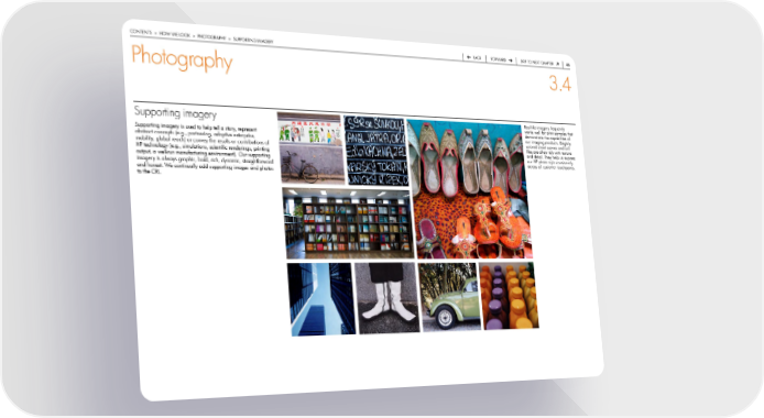 contentS > how we Look > photoGraphy > SupportinG iMaGery back forward Skip to next chapter 45 Photography 3.4 Supporting imagery real-life imagery frequently works well for print samples that demonstrate the capabilties of Supporting imagery is used to help tell a story, represent our imaging products. brightly abstract concepts (e.g., partnering, adaptive enterprise, colored street scenes and still mobility, global reach) or convey the results or contributions of lifes are often rich with texture hp technology (e.g., simulations, scientific renderings, printing and detail. they help us express output, a well-run manufacturing environment). our supporting our hp photo style consistently imagery is always graphic, bold, rich, dynamic, straightforward across all customer touchpoints. and honest. we continually add supporting images and photos to the crL.