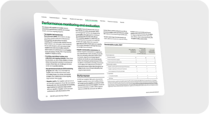 Contents Sustainable Impact Footprint Integrity and human rights Supply chain responsibility Operations Products and solutions Appendix Performance monitoring and evaluation We engage with suppliers in multiple ways to HP Supplier Code of Conduct in the areas of conduct these activities. During the year, 88% of the RBA Factory Lead Certification Program, understand performance, identify and address labor, health and safety, environment, ethics, production supplier audits were third-party certified suppliers with scores from 160 to 180 are eligible issues, and drive ongoing progress: and management systems. See Supply chain RBA Validated Assessment Program (VAP) audits. for a Silver certification, and those with scores responsibility: Our approach for detail about above 180 for a Gold certification (including 36% • The supplier Self-Assessment the audit process. We also work with our We see a wide range of maturity levels in our of supplier facilities audited in 2021). Questionnaire (SAQ). This includes detailed final assembly suppliers to confirm they are audits, which are scored on a scale of 0–200. In questions around social and environmental conducting risk assessments of companies management and practices. As well as in their own supply chains that represent assisting HP to evaluate risk, identify areas for approximately 80% of their spend and assuring Sustainability audits, 2021* improvement, and determine a firm’s inclusion 25% of sites determined to be high risk, based in our audit program, self-assessment helps on the RBA Code of Conduct. Follow-up audits suppliers become more familiar with HP’s Initial audits (initial (addressing Full re-audits expectations of conformance to our Supplier • Supplier sustainability assessments. We evaluations of nonconformances (comprehensive conduct targeted assessments to supplement conformance) identified in any reassessments) Code of Conduct. During 2021, 171 production corrective action plans) suppliers completed SAQs. our comprehensive audits, focusing on specific risk areas including vulnerable workers (such Product supply chain • Coaching, specialized training, data as student, dispatch, and foreign migrant Production suppliers 19 46 61 collection, and ongoing dialogue. Using these workers) and health and safety (including fire Product transportation suppliers 2 0 0 mechanisms, we aim to help suppliers develop safety and emergency preparedness). In 2021, robust management systems to address root we piloted a new priority screening assessment Product reuse and recycling vendors 10 0 15 causes of key risks and challenges; for more at 12 facilities that will aid faster detection of Nonproduction suppliers detail, see Capability building. high-priority human rights risks throughout our Suppliers supporting HP manufacturing (on HP premises) 30 0 0 • Key performance indicator (KPI) monitoring supply chain, so we can more efficiently drive Suppliers supporting HP offices (on HP premises) 3 0 0 program. We collect data from high-risk targeted improvement. supplier sites weekly on key issues such Service suppliers (on third-party premises) 0 0 0 as working hours, day of rest, and student HP operations workers, and collaborate to drive ongoing Performance HP manufacturing sites 2 0 1 improvement. See results. HP offices 0 0 0 • Supplier audits. Our supplier audit process is In 2021, we completed 189 audits of production suppliers, product reuse and recycling vendors, * an essential component of our risk assessment Audits of production suppliers and suppliers supporting HP manufacturing followed the RBA Code of Conduct either 6.0 or 7.0 (released and nonproduction suppliers, as well as 24 other during 2021) audit protocols. We contract with Environmental Resources Management (ERM) to audit product reuse and recycling vendors framework and a key mechanism for identifying assessments of production suppliers. Travel and for conformance with the following policies and vendor standards: Export of Electronic Waste to Developing Countries Policy, HP Supplier opportunities for sustained improvement factory restrictions, as well as office closures Code of Conduct, and Reuse and Recycling Standards. See Product repair, reuse, and recycling for detail. Audits of nonproduction suppliers with our suppliers. Supplier audits measure supporting HP offices, off-site third-party nonproduction suppliers, and HP offices were focused on labor, ethics, and management systems. conformance with all provisions of the related to COVID-19, decreased our ability to 39 2021 HP Sustainable Impact Report www.hp.com/sustainableimpact