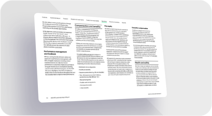 Contents Sustainable Impact Footprint Integrity and human rights Supply chain responsibility Operations Products and solutions Appendix We also deliver career growth guidance through Compensation and benefits Pay equity Executive compensation the Technical Career Path and Engineering We believe people should be paid equitably for The HR and Compensation Committee Program Management Career Path, which include HP offers a comprehensive Total Rewards what they do and how they do it, regardless discharges the HP Board of Directors’ mentoring and leadership opportunities. package that is both performance based and of their gender, race, or other personal responsibilities related to the compensation In the digital era, we have retained and expanded market competitive. Total Rewards includes characteristics. To deliver on that commitment, of our executives and directors and provides the HP concept of the “next bench”—close salaries, bonuses, incentive programs, and we benchmark and set pay ranges based on general oversight of our compensation structure, collaboration with neighboring colleagues—to a range of benefits designed to meet our relevant market data, and consider factors including our equity compensation plans and engage with and respect ideas from colleagues employees’ diverse needs while enhancing their such as an employee’s role, experience, and benefits programs. See page 26 of the HP 2022 across the business. Find out more in The Evolving wellbeing and that of their families. performance. We also regularly review our Proxy Statement for detail. Way (page 88). We have also developed a model compensation practices, in terms of both our for creating technical communities across HP Valuing and rewarding employees drives higher overall workforce and our individual employees, In accordance with U.S. Securities and Exchange that will help us meet the demands of cyber- engagement and better performance and helps to make sure our pay is fair and equitable. Commission (SEC) rules, we recently reported physical systems. Learn more. us attract and retain top talent. Compensation our CEO pay ratio for FY21. Our CEO’s annual total and benefits are reviewed periodically for For the past five years, HP has reviewed compensation for FY21 was US$20,733,806. Our Performance management market competitiveness. employees’ compensation with the support median employee’s annual total compensation of independent third-party experts to ensure was US$67,667, resulting in a CEO pay ratio of and feedback Our global wellness program is designed to consistent pay practices. 306:1. For more detail, see page 71 of the HP 2022 HP has a strong feedback-based culture and enhance physical health, financial wellness, and Proxy Statement. approach to performance management, with life balance for all of our employees around the HP expanded its annual pay equity assessment 99% of eligible employees receiving annual world. Other benefit programs vary by country to in fiscal year 2021—evaluating the nine countries multidimensional and objective-based reflect local market practice and employee needs. with our largest employee populations, which Health and safety performance evaluations. Employees participate Depending on location, these may include: represent 72% of our global workforce. The in regular feedback and development planning independent analysis determined there were no We strive to keep our employees safe and healthy • Retirement and savings plans systemic issues. Any areas of potential concern, so they can do their best work. Our environmental, conversations with their managers, and the 2021 • Healthcare benefits considering what we would expect employees to health, and safety (EHS) leadership team uses VIA survey highlighted that 87% of employees be paid when evaluating their skills, qualifications, our global injury and illness reporting system believe they receive feedback throughout the year • Insurance protections (e.g., life and disability) and experience, were reviewed and addressed as to assess worldwide and regional trends as that enables them to improve their performance. 9 part of our off-cycle compensation process. • Time-off programs (vacation, holidays, a part of quarterly reviews. We have internal 10 parental leaves, injury/illness, etc.) targets to keep lost workday case rates below • Discount programs 0.5 and recordable incidence rates under 1.0 (see definitions of these rates), and our managers • Flexible work arrangements assess progress against those targets annually. • Stock purchase plan Supervisors of employees injured at work • Other benefits are required to complete injury and illness 51 2021 HP Sustainable Impact Report www.hp.com/sustainableimpact