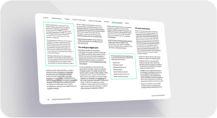 Contents Sustainable Impact Footprint Integrity and human rights Supply chain responsibility Operations Products and solutions Appendix Product design and development operations training, walk-through simulation, and immersive Life cycle assessment Supporting HP’s efforts to become a more for our personal computing products, LaserJet experiences. Augmented reality and VR in HP uses LCAs and product carbon footprinting circular business, we carried out our second Enterprise Solutions, and InkJet Printing Solutions employee training can replace classroom-style (PCF)4 performance assessment using the Ellen are International Organization for Standardization learning or be used to train for specific manual to quantify the environmental impacts of MacArthur Foundation (EMF) Circulytics tool in (ISO) 14001 certified. We conduct internal tasks, and is a focus area for HP’s Innovation our products, analyze possible alternatives, and early 2022. Developed by the EMF to accelerate compliance audits and benchmark against Garage and Campus of the Future initiatives. target product performance improvements that the transition to the circular economy, it is industry best practices on an ongoing basis. See Education. deliver value to our customers and our business. a comprehensive circularity measurement We have conducted LCAs and PCFs of hundreds system for companies. Relevant products obtain a range of external In 2021, HP joined the International Green Book of products over the last several years, spanning The assessment includes data across dozens certifications (see Product certifications and Supply Chain Alliance to support more our product portfolio. As we develop and expand of metrics, including a company’s products, other information). sustainable practices within the publishing our service-based models (which we refer to material flows, energy, water, infrastructure, industry, particularly efforts to eliminate waste as circular business solutions), we will continue and leadership. During the assessment, we The analog-to-digital shift and reduce environmental impact. to study and quantify the potential they have to documented incremental improvements to reduce environmental impacts and drive progress HP’s scores for both Enablers (which support HP industrial graphics and 3D printing toward a more circular and net zero carbon future progress) and Outcomes (which relate to technologies are driving an analog-to-digital shift economy. In 2021, we: current performance). by enabling cost-efficient short runs that reduce We also participated in panel discussions in inventory and waste and enable companies to HP won seven Green Good Design Awards • Conducted or updated 15 LCAs of HP desktop, late 2021 and early 2022 to provide feedback on engage with customers in new and exciting ways, for personal systems products in 2021. Our DesignJet, scanners, and enterprise printers. the tool, suggesting refinements to the process including through customized and quicker-to- winning products included: • Completed 373 PCFs of new business HP and offering guidance and support to other market products. See HP’s Digital Manufacturing • HP Elite Folio desktops, notebooks, tablets, workstations, organizations considering adopting Circulytics. Trends Report. thin clients, All-in-One computers, and displays • HP Spectre x360 14 to better understand performance and inform Across our portfolio, we offer solutions that • HP ProBook 635 Aero G7 ongoing design improvements. apply digital technology to improve traditionally • HP Renew Sleeve Among our main design priorities, we work to analog processes. For example, in the podiatry • Completed an ISO-compliant, peer-reviewed increase the use of recycled and renewable industry, clinics are able to replace highly variable, • HP U27 4K Wireless Monitor LCA of the HP Z4 G4 Workstation, which found materials; practice responsible chemistry; manual processes to create custom orthoses • HP EliteOne 800 G6 All-in-One its most significant environmental impacts enhance product repairability, reusability, with accurate, repeatable, and consistent digital • HP Elite c1030 Chromebook occurred during use. The circuit board and longevity, and recyclability; continually improve workflows and 3D printing. See Healthcare. HP storage components were the most significant product energy efficiency; and build in accessibility also works closely with customers across product impact drivers during production, followed by features. Our program has continually evolved design, architecture, engineering, training, mechanical components and the power supply. in response to technological and scientific healthcare, and location-based entertainment to • Evaluated the potential to decrease GHG developments, changes to our supply chain, and apply virtual reality (VR) technology to activities emissions associated with molded fiber customer demand. such as product development, employee packaging tooling, by switching from metal 68 2021 HP Sustainable Impact Report www.hp.com/sustainableimpact