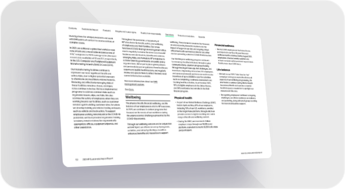 Contents Sustainable Impact Footprint Integrity and human rights Supply chain responsibility Operations Products and solutions Appendix investigations for all injury incidents and work Throughout the pandemic, a top priority of wellbeing. These included sessions that focused Financial wellness with EHS points of contact to assess serious or HP’s has been the health, safety, and wellbeing on understanding biometric markers and the • Nearly 3,000 employees in the United States complex cases. of employees and their families. Our cross- impact of sugar on our diet, and ongoing virtual participated in our $ave Beyond financial functional COVID-19 program management office office hours with our medical director and other wellness month activities. During August 2021, In 2021, we achieved a global lost workday case meets regularly to review the latest data from HP doctors providing validated COVID-19 information. rate of 0.06 and a recordable incidence rate of business and site leaders, identify and address employees attended weekly question and 11 Our Well Beyond wellbeing program continued answer sessions with investment experts from 0.13, compared to 2020 average rates (the most emerging risks, and formulate HP’s response to recent data available) of 0.1 and 0.4, respectively, actions taken by governments and public policy to encourage healthy behaviors through regular Fidelity more than 1,300 times. in the U.S. Computer and Peripheral Equipment organizations. We’ve put in place global policies communications, voluntary progress tracking Manufacturing industry (NAICS Code 33411). and protocols based on guidance from healthcare through the Virgin Pulse app, fun challenges, and Life balance experts and public health leaders, and regularly incentives. Depending on location, U.S. employees • We built on our 2020 “Take Time for You” Our manufacturing facilities continue to review and update them to reflect the best, most and spouses/domestic partners can each receive represent our most significant health and current information available. incentives of up to US$550 a year for activities campaign to integrate mental health into all safety risks, due to higher potential exposure such as completing a wellness assessment and aspects of our wellbeing programming. We to chemicals and machinery-related hazards. See more information about our EHS tracking healthy activities. As of October 2021, also hosted a webinar during Mental Health Reducing and effectively managing risks at management system. 78% of eligible employees in the United States, Awareness Month and launched a mental these facilities remains a focus, and injury and 59% worldwide, had enrolled in the Well health-focused e-newsletter to spotlight our rates continue to be low. We have implemented See Data. Beyond program. resources in this area. programs to address common risks such as • Recognizing employees’ continued caregiving ergonomic issues, slips, and falls. We also Wellbeing Physical health challenges, we offered webinars on resiliency address the safety of employees when they are and parenting, along with small group coaching working beyond our facilities, such as customer The physical health, financial wellbeing, and life • As part of our Global Wellness Challenge (GWC) for more individualized support. service agents visiting customer sites, for whom balance of our employees is vital to HP’s success. held in April and May, 61% of our employees, we develop training and related testing on issues In 2021, we continued to deliver programs that including 79% of our U.S. workforce, enrolled such as vehicle and back safety. To support focused on the needs of our workforce during in the Virgin Pulse platform, through which we employees working remotely since the COVID-19 the unprecedented challenges presented by the provide access to digital coaching and a wide pandemic, we have provided ergonomic training COVID-19 pandemic. range of health and wellbeing content. sessions, remote reviews for ergonomically • During the GWC, we recorded 6.7 billion appropriate offices, equipment stipends, and Through our wellbeing vendors and in conjunction employee steps through our Well Beyond other assistance. with HP Spirit, we offered an array of programs, platform, equivalent to nearly 10,200 daily steps activities, and virtual gatherings, as well as per participant. enhanced benefits and resources to support 52 2021 HP Sustainable Impact Report www.hp.com/sustainableimpact