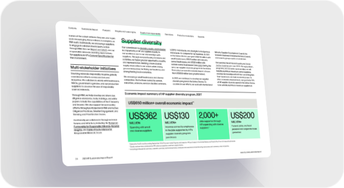 Contents Sustainable Impact Footprint Integrity and human rights Supply chain responsibility Operations Products and solutions Appendix names of the cobalt refiners they use, and to join Supplier diversity us in encouraging these refiners to complete an RMI audit. Additionally, we encourage suppliers to engage in collaborative industry action Our commitment to diversity, equity, and inclusion LGBTQ+ individuals, and aboriginal or indigenous Minority Supplier Development Council, the through RMI. See our Report on Cobalt, and our is a top priority at HP and applies equally to individuals—to compete for our business. In 2021 Women’s Business Enterprise National Council, responsible minerals sourcing expectations our workforce and to our relationships with in the United States, we spent US$276 million with and industry groups such as tech:SCALE. for suppliers in HP’s General Specification for suppliers. Through our purchasing decisions and small businesses, US$79 million with minority- the Environment. activities, we foster greater opportunity, equality, owned businesses, and US$91 million with We launched the HP Racial Equality and Social and representation. Building a more diverse 1 Justice Task Force in June 2020. Through policies, women-owned businesses (see data). During the supply chain reflects our values while driving year, our supplier diversity program in the United programs, and executive sponsorships, we will Multi-stakeholder initiatives greater innovation, fortifying our business, and States had an overall economic impact of more help Black/African American-owned suppliers strengthening local economies. than US$650 million (see graphic below). develop relationships with HP that can strengthen Sourcing minerals responsibly requires globally their businesses and build economic power. To coordinated efforts across sectors and We encourage small businesses and diverse In 2021, we continued to develop our supplier drive economic empowerment, our goal is for 10% industries. We collaborate widely with businesses, companies—that is those owned by women, diversity program in the United States. To of HP supplier diversity spend in the United States NGOs, government agencies, and our production minorities, veterans, service-disabled veterans, accelerate our efforts, we work with the National to be with Black/African American suppliers in suppliers to advance the use of responsibly sourced minerals. Economic impact summary of HP supplier diversity program, 2021* Through RMI, we help develop and share due diligence standards, tools, trainings, and white papers to build the capabilities of the IT industry US$650 million+ overall economic impact** and beyond. We also support broader policy efforts through participation in RMI and its Due Diligence Practices, Smelter Engagement, and Sensing and Prioritization Teams. US$362 US$130 2,000+ US$200 Additionally, we collaborate through external Jobs supported through forums and initiatives, including the European MILLION MILLION+ MILLION+ Partnership for Responsible Minerals, Material Spending with small Incomes earned by employees HP’s spending with diverse Federal, state, and local Insights, and Public-Private Alliance for suppliers*** Responsible Minerals Trade. and diverse suppliers in the jobs supported by HP’s personal and corporate taxes supplier diversity program generated purchases * Data is for the 12 months ending September 30 of the year noted. Figures are based on HP purchases in the United States and Puerto Rico from U.S.-based businesses. ** Goods and services produced by HP’s diverse suppliers and their supply chains. *** Including professional services, scientific services, technical services, computer and electronic manufacturing, real estate, and numerous other industries. 34 2021 HP Sustainable Impact Report www.hp.com/sustainableimpact