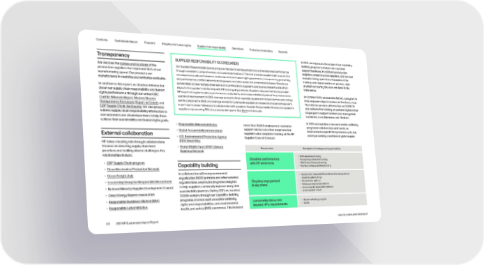 Contents Sustainable Impact Footprint Integrity and human rights Supply chain responsibility Operations Products and solutions Appendix Transparency In 2021, we expanded the scope of our capability- SUPPLIER RESPONSIBILITY SCORECARDS building program to include our customer support business, in addition to production We disclose the names and locations of the Our Supplier Responsibility Scorecards are intended to set expectations and drive improved performance suppliers, nonproduction suppliers, and our own production suppliers that represent 95% of our through consistent, comprehensive, and actionable feedback. This tool provides suppliers with a score that manufacturing operations. Examples of the manufacturing spend. Our products are encompasses audit performance; environmental and human rights governance, transparency, goal setting, trainings and opportunities we provide, eight manufactured in countries and territories worldwide. and performance; conflict minerals management; and other social and environmental topics. Results are of which ran during the year, are listed in the summarized across multiple dimensions and contribute to a supplier’s overall procurement score, which table below. In addition to this report, we disclose information impacts the supplier’s relationship with HP and ongoing business. Suppliers discuss their Scorecard with about our supply chain responsibility and human HP as part of regular business performance evaluations, and receive additional points if they demonstrate In October 2020, we launched MOVE, a program to rights performance through our annual SEC sustained improvement. In 2021, average scores for final assembly suppliers increased by three percentage help empower migrant workers in Southeast Asia. Conflict Minerals Report, Modern Slavery points compared to 2020, and average scores for commodity suppliers increased by one percentage point, The initiative provides information on COVID-19 Transparency Statement, Report on Cobalt, and in part due to closer followup and collaboration with suppliers. Supplier Responsibility Scorecards applied to and delivers free training on workers’ rights in four CDP Supply Chain disclosures. We also provide suppliers representing 76% of our production spend. See Data for full results. languages to support workers and managers in tailored supply chain responsibility information to Cambodia, Laos, Myanmar, and Thailand. our customers and channel partners to help them achieve their sustainability and human rights goals. In 2019, we launched a two-year worker wellbeing • Responsible Minerals Initiative more than 16,000 employees at customer program in collaboration with Verité, an • Social Accountability International support-related and other nonproduction international nonprofit that promotes safe, fair, External collaboration suppliers who completed training on the HP and legal working conditions in global supply • U.S. Environmental Protection Agency Supplier Code of Conduct. HP takes a leading role through collaborations (EPA) SmartWay focused on elevating supply chain best • World Wildlife Fund (WWF) Climate Focus areas Examples of trainings and opportunities practices and tackling shared challenges. Key Business Network relationships include: • EHS awareness training Baseline conformance • Foreign migrant worker training • CDP Supply Chain program Capability building with HP standards • RBA Code of Conduct training • Clean Electronics Production Network • Rights and Responsibilities training • Green Freight Asia In collaboration with nongovernmental • Supply chain responsibility workshop (including science- organization (NGO) partners and other external based targets training) • Leadership Group for Responsible Recruitment organizations, we provide programs designed Ongoing engagement • Forced labor webinar • National Minority Supplier Development Council to help suppliers continually improve along their in key areas • Grievance mechanism webinar sustainability journeys. During 2021, we reached • Environmental expectation webinar • Clean Energy Buyers Association • Brazil Supplier Forum 37,000 workers through our capability-building • Responsible Business Alliance (RBA) programs, in areas such as worker wellbeing, Leadership above and rights and responsibilities, and environmental, • Worker wellbeing program • Responsible Labor Initiative health, and safety (EHS) awareness. This included beyond HP’s requirements • MOVE 30 2021 HP Sustainable Impact Report www.hp.com/sustainableimpact