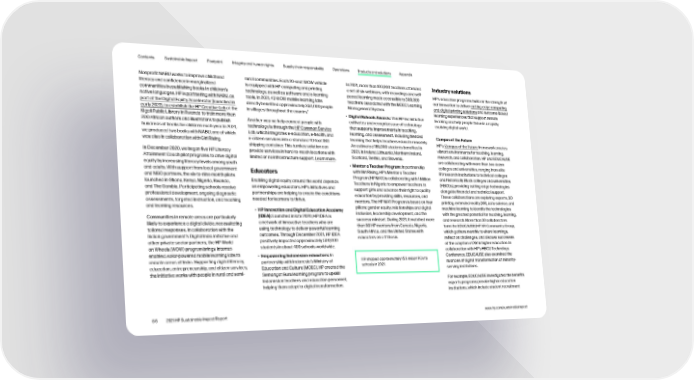Contents Sustainable Impact Footprint Integrity and human rights Supply chain responsibility Operations Products and solutions Appendix Nonprofit NABU works to improve childhood rural communities. Each 20-seat WOW vehicle In 2021, more than 100,000 teachers attended Industry solutions literacy and confidence in marginalized is equipped with HP computing and printing a set of six webinars, with recordings and self- HP’s education programs build on the strength of communities by publishing books in children’s technology, as well as software and e-learning paced learning made accessible to 300,000 our innovation to deliver cutting-edge computing native languages. HP is partnering with NABU, as tools. In 2021, 43 WOW mobile learning labs teachers associated with the MOEC Learning and digital printing solutions and outcome-based part of the Digital Equity Accelerator (launched in directly benefited approximately 350,000 people Management System. learning experiences that support remote 4 early 2022), to establish the HP Creative Lab at the in villages throughout the country. • Digital Schools Awards: This HP-led initiative learning and help people thrive in a rapidly Kigali Public Library in Rwanda to train more than cultivates and recognizes use of technology evolving digital world. 200 African authors and illustrators to publish Another way we help connect people with that supports improvements in teaching, hundreds of books for children each year. In 2021, technology is through the HP Common Service learning, and assessment, including blended we produced two books with NABU, one of which Lab, which integrates e-education, e-health, and learning that helps teachers educate remotely. Campus of the Future was also in collaboration with Girl Rising. e-citizen services into a standard 40-foot ISO An estimated 185,000 students benefited in HP’s Campus of the Future framework creates shipping container. This turnkey solution can 2021, in Ireland, Lithuania, Northern Ireland, vibrant environments for teaching, learning, In December 2020, we began five HP Literacy provide services in hard-to-reach locations with research, and collaboration. HP and EDUCAUSE Attainment Coach pilot programs to drive digital limited or no infrastructure support. Learn more. Scotland, Serbia, and Slovenia. are collaborating with more than two dozen equity by increasing literacy levels among youth • Mentor a Teacher Program: In partnership colleges and universities, ranging from elite and adults. With support from local government Educators with Girl Rising, HP’s Mentor a Teacher R1 research institutions to technical colleges and NGO partners, the six-to-nine-month pilots Program (HP MAT) is collaborating with 1 Million and historically Black colleges and universities launched in Ghana, Kenya, Nigeria, Rwanda, Enabling digital equity around the world depends Teachers in Nigeria to empower teachers to (HBCUs), providing cutting-edge technologies and The Gambia. Participating schools receive on empowering educators. HP’s initiatives and support girls and advance their right to quality alongside financial and technical support. professional development, ongoing diagnostic partnerships are helping to create the conditions education by providing skills, resources, and These collaborations are exploring esports, 3D assessments, targeted instruction, and teaching needed for learners to thrive. mentors. The HP MAT Program is based on four printing, extended reality (XR), data science, and and learning resources. • HP Innovation and Digital Education Academy pillars: gender equity, relationships and digital machine learning to identify the technologies Communities in remote areas are particularly (IDEA): Launched in late 2020, HP IDEA is inclusion, leadership development, and the with the greatest potential for teaching, learning, likely to experience a digital divide, necessitating a network of innovative teachers who are success mindset. During 2021, it matched more and research. More than 30 collaborators tailored responses. In collaboration with the using technology to deliver powerful learning than 90 HP mentors from Canada, Nigeria, form the EDUCAUSE/HP XR Community Group, Indian government’s Digital India initiative and outcomes. Through December 2021, HP IDEA South Africa, and the United States with which gathers monthly to share learnings, other private sector partners, the HP World positively impacted approximately 500,000 educators on a 1:1 basis. reflect on challenges, and discuss successes on Wheels (WOW) program brings internet- students in about 400 schools worldwide. of the adoption of XR in higher education. In enabled, solar-powered mobile learning labs to collaboration with HP’s HBCU Technology • Empowering Indonesian educators: In Conference, EDUCAUSE also examined the remote areas of India. Supporting digital literacy, partnership with Indonesia’s Ministry of HP shipped approximately 15.6 million PCs to nuances of digital transformation at minority- education, entrepreneurship, and citizen services, Education and Culture (MOEC), HP created the schools in 2021. serving institutions. the initiative works with people in rural and semi- Semangat Guru learning program to upskill Indonesian teachers and education personnel, For example, EDUCAUSE investigated the benefits helping them adapt to digital transformation. esports programs provide higher education institutions, which include student recruitment 86 2021 HP Sustainable Impact Report www.hp.com/sustainableimpact