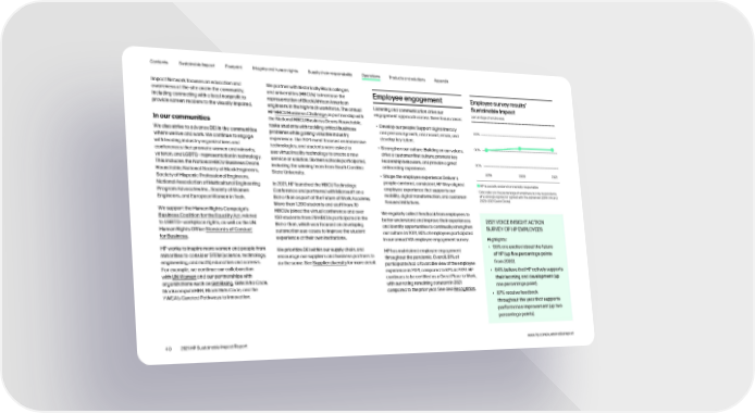 Contents Sustainable Impact Footprint Integrity and human rights Supply chain responsibility Operations Products and solutions Appendix Impact Network focuses on education and We partner with historically Black colleges awareness at the site and in the community, and universities (HBCUs) to increase the Employee engagement Employee survey results* including connecting with a local nonprofit to representation of Black/African American Listening and communication drive our Sustainable Impact provide screen readers to the visually impaired. engineers in the high-tech workforce. The annual engagement approach across three focus areas: percentage of employees HP HBCU Business Challenge, in partnership with In our communities the National HBCU Business Deans Roundtable, • Develop our people: Support digital literacy tasks students with tackling critical business and personal growth, and recruit, retain, and 100% We also strive to advance DEI in the communities problems while gaining valuable industry develop key talent. where we live and work. We continue to engage experience. The 2021 event focused on immersive with leading industry organizations and technologies, and students were asked to • Strengthen our culture: Building on our values, 90% conferences that promote women and minority, use virtual reality technology to create a new drive a customer-first culture, promote key veteran, and LGBTQ+ representation in technology. service or solution. Sixteen schools participated, leadership behaviors, and provide a great 80% This includes the National HBCU Business Deans including the winning team from South Carolina onboarding experience. Roundtable, National Society of Black Engineers, State University. 2019 2020 2021 Society of Hispanic Professional Engineers, • Shape the employee experience: Deliver a National Association of Multicultural Engineering In 2021, HP launched the HBCU Technology people-centered, consistent, HP Way-aligned HP is socially and environmentally responsible employee experience that supports our * Program Advocates Inc., Society of Women Conference and partnered with Microsoft on a Data refers to the percentage of employee survey respondents mobility, digital transformation, and customer- who strongly agreed or agreed with the statement (2019 VIA and Engineers, and European Women in Tech. Bot-a-thon as part of the Future of Work Academy. focused initiatives. 2020–2021 Quick Clicks). More than 1,200 students and staff from 70 We support the Human Rights Campaign’s HBCUs joined the virtual conference and over We regularly collect feedback from employees to Business Coalition for the Equality Act, related 150 students from 29 HBCUs participated in the better understand and improve their experiences 2021 VOICE INSIGHT ACTION to LGBTQ+ workplace rights, as well as the UN Bot-a-thon, which was focused on developing and identify opportunities to continually strengthen Human Rights Office Standards of Conduct automation use-cases to improve the student our culture. In 2021, 95% of employees participated SURVEY OF HP EMPLOYEES for Business. experience at their own institutions. in our annual VIA employee engagement survey. Highlights: HP works to inspire more women and people from We prioritize DEI within our supply chain, and HP has maintained employee engagement • 85% are excited about the future minorities to consider STEM (science, technology, encourage our suppliers and business partners to throughout the pandemic. Overall, 81% of of HP (up five percentage points engineering, and math) education and careers. do the same. See Supplier diversity for more detail. participants had a favorable view of the employee from 2020). For example, we continue our collaboration experience in 2021, compared to 82% in 2020. HP • 84% believe that HP actively supports with UN Women and our partnerships with continues to be certified as a Great Place to Work, their learning and development (up organizations such as Girl Rising, Girls Who Code, with our rating remaining constant in 2021 blackcomputeHER, Black Girls Code, and the compared to the prior year. See also Recognition. one percentage point). YWCA’s Curated Pathways to Innovation. • 87% receive feedback throughout the year that supports performance improvement (up two percentage points). 49 2021 HP Sustainable Impact Report www.hp.com/sustainableimpact