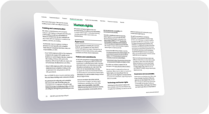 Contents Sustainable Impact Footprint Integrity and human rights Supply chain responsibility Operations Products and solutions Appendix once every three years. Third parties receive Human rights training as part of HP’s due diligence process. Training and communication HP’s stance on human rights is clear and and data protection, accessibility, and unintended purposes or in contexts that create uncompromising. We embrace our responsibility environmental sustainability. adverse human rights impacts. We deliver comprehensive anti-corruption to respect human rights, continually monitoring content to all employees through annual Integrity emerging human rights expectations and Our policy commitment includes respecting We sell PCs and printers to consumers, at HP training, as well as to all members of best practices. human rights in accordance with the United businesses, and governments worldwide. These the Board of Directors. We also communicate Nations Guiding Principles on Business and products and technologies are widely available in year-round with our employees to reinforce our Human Rights (UNGPs) and the Organisation the market from HP and its competitors. To avoid policies, controls, and training. Approach for Economic Co-operation and Development the misuse of our products and solutions, HP is (OECD) Guidelines for Multinational Enterprises. committed to complying with all relevant sanctions, Additionally, targeted employee training is We are committed to ensuring that everyone We commit to respect internationally recognized restrictions, and embargoes imposed by national provided to cover specific anti-corruption within HP and throughout our value chain is human rights as expressed in the: governments or international organizations across risks relevant to business functions, roles, and treated with dignity and respect. We insist that all our worldwide operations. In all of our business, responsibilities. In 2021: workers are treated fairly and have safe working • International Bill of Human Rights, meaning we prioritize the highest standards of corporate conditions and freely chosen employment. the Universal Declaration of Human Rights, the ethics, and we operate in strict accordance with all • Over 13,100 employees (99% of the employees International Covenant on Civil and Political applicable laws and regulations. assigned) who support HP’s public sector Policies and commitments Rights, and the International Covenant on business or work in higher-risk jobs completed Economic, Social and Cultural Rights. When we identify potential human rights risks this training. Of these, 33% were in the In 2021, HP strengthened its Human Rights Policy • International Labour Organization’s Declaration within our value chain, we conduct human rights Americas, 35% in Asia Pacific and Japan, and (available in 24 languages), which advances our on Fundamental Principles and Rights at Work. due diligence. When others make allegations 32% in Europe, the Middle East, and Africa. commitment to upholding human rights, engaging linking our business to adverse human rights with rights holders, and embedding our approach In addition, we continue to support the Ten impacts, we investigate the claims in line with • About 3,390 employees (92% of the relevant throughout our business and value chain. This Principles of the United Nations Global Compact. our Human Rights Policy. Wherever we can employee base) completed training on the policy and our Sustainable Impact strategy exert influence to mitigate alleged human rights requirements for doing business with the recognize that social and environmental issues We also commit to comply with local laws and impacts we do so. U.S. government. are interconnected, and many have human rights regulations. Where laws are silent as to protected dimensions. We work for holistic change across a human rights or are less stringent than our Governance and accountability Due to COVID-19-related travel restrictions during approach, we work diligently to develop solutions the year, these trainings were conducted virtually. broad range of areas. to advance our commitment, supporting progress Our President and Chief Executive Officer, who We have developed specialized policies wherever possible. is also a member of our Board of Directors, Requirements for mitigating anti-corruption approved our Human Rights Policy, and our risk associated with charitable giving are and practices to support our human rights communicated to employees through the HP commitments, including those addressing Technology and human rights Head of Corporate Affairs holds operational Global Charitable Contributions Policy, and risks supply chain responsibility, responsible Technology has the potential to improve the accountability for this policy. The Head of are mitigated through the grantmaking process. minerals sourcing, human resources, diversity, lives of people around the world. However, we Corporate Affairs, Chief Supply Chain Officer, equity, and inclusion, racial equality, privacy recognize that technology can also be used for and Chief People Officer are responsible for 23 2021 HP Sustainable Impact Report www.hp.com/sustainableimpact