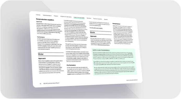 Contents Sustainable Impact Footprint Integrity and human rights Supply chain responsibility Operations Products and solutions Appendix Nonproduction suppliers To identify supplier sites located in water- to year-over-year variations in data. By the end Performance Approach stressed areas, we use water risk assessment of 2020, 94% of our suppliers, by spend, had set During 2020, the most recent year for which data tools such as the World Resources Institute’s water management goals. is available, our suppliers generated 126,000 We purchase a wide range of goods and services Aqueduct Water Risk Atlas tool. We also identify related to the operations of HP, such as staffing, sites that manufacture relatively water-intense See HP’s 2021 water footprint. tonnes of nonhazardous waste associated with business consulting, marketing, and travel. product types, and use this information to assess HP, a 14% decrease from 2019. This was primarily We prioritize collaboration with nonproduction overall water stress risks and opportunities. due to reduced waste generation at a significant suppliers based on geographical risk and industry, We ask our suppliers to report water risk, use, Waste supplier through waste prevention, reuse, and and provide training to help improve reporting and management information through the CDP recycling efforts. Suppliers generated 46,000 and reduce GHG emissions. Supply Chain program. This drives suppliers’ Approach tonnes of hazardous waste associated with HP awareness of water security issues and allows us in 2020, down 13% compared to the prior year. Performance to assess suppliers’ current water management We work with production suppliers to encourage This was due largely to significant reductions by In 2020, the most recent year for which data strategies in the context of local environments waste measurement and reporting, reduce waste three suppliers. By the end of 2020, 76% of our is available, our nonproduction suppliers and communities. volumes, and drive progress toward a circular production suppliers, by spend, had set waste- reported 140,000 tonnes of Scope 1 and economy. HP requests our suppliers report on related goals, up from 72% the prior year. Scope 2 CO e emissions attributable to HP. See Through the use of best practice frameworks, waste using the RBA Environmental Survey. 2 we also work with suppliers to improve water detail in Footprint. During that year, 56% of HP reporting and, when appropriate, to enhance nonproduction strategic suppliers produced water management practices. environmental reports. SUPPLY CHAIN TRANSPARENCY To further drive improvements, we include water Much of our production supplier base is in China, so we have a particular focus in that area. The Corporate Water stewardship criteria in our Supplier Responsibility Information Transparency Index, developed by the Institute of Public & Environmental Affairs (IPE) and NRDC, Scorecard. Suppliers are scored for transparently evaluates the environmental practices of global brands’ supply chains in China. In 2021, HP ranked #7 among reporting quantitative water withdrawal as well global IT companies and #31 overall, of more than 600 brands assessed. On the Supply Chain Climate Action Approach as for having a public company-wide policy or Transparency Index, developed by IPE and CDP, HP ranked #15 of about 680 brands. Many of our suppliers operate in regions where governance structure for water at the board of water stress is a growing threat. We work director or top executive level. During 2021, we continued encouraging our suppliers to submit inventories of substances released through with production suppliers to improve water IPE’s public pollutant release and transfer register system, and cross-checked supplier sites representing 95% management in their operations, including Performance of our spend against IPE’s public database of environmental violations. through the Supplier Code of Conduct, which In 2020, the most recent year for which data We also collaborated with first-tier manufacturing suppliers in China to determine whether sub-tier suppliers contains provisions on water management, is available, production suppliers withdrew 36 complied with local environmental laws. This review of 730 sub-tier suppliers identified 27 reported violations in pollution prevention and resource use reduction, million cubic meters of water associated with HP, 2021. Of these, 18 had been corrected as of November 2021, and we continue working with the relevant first-tier and environmental permits and reporting. 3% less than in 2019. We believe that stronger suppliers and IPE to address and resolve the remaining issues. Business with several sub-tier suppliers has supplier water-accounting practices contributed been suspended due to unaddressed environmental violations. 38 2021 HP Sustainable Impact Report www.hp.com/sustainableimpact