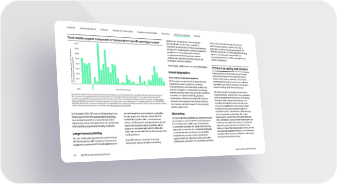 Contents Sustainable Impact Footprint Integrity and human rights Supply chain responsibility Operations Products and solutions Appendix applications involving toys.4 Test results for HP PA 11, HP PA 12, HP PA 12 GB, HP CB PA 12, Total volatile organic compounds emissions from non-HP cartridges tested* specific HP inks can be made available to HP PP enabled by BASF, and HP TPA enabled customers upon request. For these assessments, by Evonik, as well as the corresponding HP 3D 400% we typically consider general chemical regulatory 600/700/710 and HP 3D 710 R Fusing and Detailing 30% compliance criteria and material-specific Agents, have been tested for problematic s % requirements for ink formulations, with an heavy metals, phthalates, BPA, and migration of n o i 300% emphasis on standards relating to paper and certain components. s s i m t printing on books and puzzles. s ei 0% m d i n l l u e See Product certifications and other information. o g p n 00% Product security and privacy m e A o u c cl i e B0% Cybersecurity is an increasing concern for our n h Industrial graphics a g r w t customers worldwide. We continually work to o e ol 00% l e i t Food contact material compliance enhance HP products, solutions, and services a r b l o e o0% to offer industry-leading security and resiliency l vv We incorporate relevant food contact material a o t b o capabilities, and seek to address and anticipate T a regulations, industry guidance, and brand 0 requirements into our formulation qualification an ever-evolving cyber-threat landscape. -0% Non-HP brands tested process to support a variety of food packaging HP follows security-by-design and privacy-by- printing solutions offered by our Indigo, PageWide design principles, including Zero Trust principles, * Results from two WKI studies: 2022 WKI Emissions Testing study, commissioned by HP, in compliance with Blue Angel protocol DE-UZ Industrial, and Specialty Printing Systems in the development of our products, from design 219: 22 non-HP (17 imitation and five remanufactured) toner cartridge brands compatible with HP Color LaserJet Enterprise M553X technologies. Whenever possible, HP strives to and HP LaserJet M404dn purchased in the North America, Latin America, and Europe, Middle East, and Africa regions. See HP.com/go/ formulate with chemicals previously evaluated through manufacturing, renewal/reuse, and IAQnonhpWKI2022. March 2021 WKI Blue Angel Indoor Air Quality study, commissioned by HP, in compliance with DE-UZ 205: 12 imitation recycling. We build protection, detection, and and three remanufactured toner cartridge brands compatible with HP LaserJet Pro M402dne and M403d (26A, 28A) purchased in Australia, and deemed suitable for use in food packaging China, Korea, Malaysia, Singapore, and Thailand. See HP.com/go/IAQnonhpAPJ2021. printing applications. recovery capabilities into the devices, not just in software, providing customers separate, In December 2021, HP won an Outstanding Case the ink formulation to determine its suitability 3D printing auditable security mechanisms to help manage Study award from the Sustainable Purchasing for the application. We also obtain the ECO and recover from security risks. We design Leadership Council for a study that provides PASSPORT by OEKO-TEX®, an independent For our 3D printing solutions, we conduct a hazard business PCs and printers with future threats in information about the importance of considering safety certification for chemicals and colorants and regulatory assessment for each substance mind, with built-in hardware-enforced security and IAQ in printing-system purchasing decisions. used in the manufacturing of textiles, which in the fusing and detailing agent formulations resiliency capabilities that integrate seamlessly supports customers who wish to obtain the to determine suitability for applications such as with an organization’s broader infrastructure. Large format printing OEKO-TEX STANDARD 100 certification for their toys, medical devices, and cosmetics packaging. Aiming to deliver the most secure devices, and the textile products. To ensure we meet customers’ sustainability services and solutions to help our customers use For our textile printing solutions, which include requirements, we also review formulations endpoint infrastructures safely and confidently, is HP Stitch printers, HP conducts a hazard and Some HP inks are assessed to provide against restricted substances lists as required the foundation of our strategy. regulatory assessment for each substance in information about suitability for printing by individual customers. HP 3D printing materials 83 2021 HP Sustainable Impact Report www.hp.com/sustainableimpact