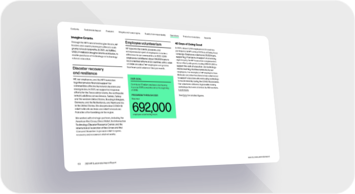 Contents Sustainable Impact Footprint Integrity and human rights Supply chain responsibility Operations Products and solutions Appendix Imagine Grants Employee volunteerism 40 Days of Doing Good Through the HP Foundation Imagine Grants, HP In 2021, almost 3,700 employees in 51 countries leaders and country managers allocate cash HP taps into the talents, passions, and participated in HP’s annual 40 Days of Doing Good grants to local nonprofits. In 2021, we fulfilled entrepreneurial spirit of employees to make a campaign. Employees volunteered 26,150 hours, US$1.24 million in Imagine Grants worldwide, to difference in our communities. In 2021, 9,200 supporting 171 projects. In support of advancing enable purchase of technology or technology- employees contributed about 136,000 hours to digital equity, the HP Foundation complemented related education. local volunteer efforts in 58 countries, with a value these efforts with grants totaling US$494,000 to 3 support the work of education- and technology- of US$8.58 million. HP employees are granted four hours paid volunteer time per month. related learning charities nominated by our Disaster recovery employees. For example, 54 HP employees from and resilience Malaysia and other locations in Asia volunteered to support educators who were using technology HP, our employees, and the HP Foundation 2025 GOAL to teach remotely during the COVID-19 pandemic. together provide financial support for Contribute 1.5 million employee volunteering Our volunteers delivered digital skills training communities affected by natural disasters and hours by 2025 (cumulative since the beginning workshops that were attended by 169 teachers. emergencies. In 2021, we supported response of 2016) Learn more. efforts for the Texas winter storm, the earthquake PROGRESS THROUGH 2021 See Data for detailed figures. in Haiti, wildfires across Greece, Tunisia, Turkey and the western United States, flooding in Belgium, Reached Germany, and the Netherlands, and Hurricane Ida in the United States. We also provided COVID-19 relief to Brazil and India and relief to Israel and 692,000 Palestine after bombings in the region. employee volunteering hours We worked with strategic partners, including the American Red Cross, Direct Relief, the Information Technology Disaster Resource Center, and the International Federation of Red Cross and Red Crescent Societies to provide relief to speed recovery and reconnect vital networks. 60 2021 HP Sustainable Impact Report www.hp.com/sustainableimpact