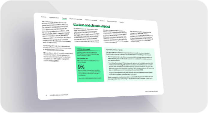 Contents Sustainable Impact Footprint Integrity and human rights Supply chain responsibility Operations Products and solutions Appendix The manufacturing, delivery, and use of HP Carbon and climate impact products and solutions requires a substantial amount of natural resources and energy use. Our carbon and water footprints cover our We strive to reduce the climate impact of our to product transportation. This reduction was While GHG emissions from our operations only 1 supply chain, operations, and products and driven in part by the increased energy efficiency represent 1% of our footprint, we work to entire global value chain, from suppliers to our operations and millions of customers worldwide. solutions. HP’s carbon footprint in 2021 equaled of our products as well as the continued impact demonstrate leadership in emissions management, We were the first global IT company to publish 28,459,500 tonnes of carbon dioxide equivalent of COVID-19 on sales of different product lines, reduction, and disclosure. Our global operations a full carbon footprint, and one of the first to (CO2e), 3% less than in 2020. An 11% decrease particularly a shift toward Chromebooks, other produced 159,500 tonnes of Scope 1 and Scope 2 disclose a complete water footprint. We continue in GHG emissions associated with product notebooks, and inkjet printers, which tend to be COe emissions during 2021, a 7% decrease 2 to measure and manage our environmental use more than offset a 3% increase related to lighter and are more energy efficient than desktop compared to 2020. footprint across the value chain, always pursuing product manufacturing and a 13% rise related PCs and LaserJet printers. areas for improvement. Transforming HP to help drive a more efficient, circular, and net zero carbon economy is central 2030 AND 2040 GOALS METHODOLOGICAL UPDATES to our Sustainable Impact strategy. Reduce HP value chain GHG emissions by This report reflects several methodological updates to improve the accuracy of our carbon HP has achieved triple “A” scores for transparency 50% by 2030 (compared to 2019), and achieve footprint calculations and to align with our 2030 GHG emissions-reduction goal. These include: and action on climate, forests, and water for net zero emissions by 20401 several consecutive years, and has also been • Personal systems: Using a new life cycle assessment (LCA) tool, which allows for updated and recognized as a CDP Supplier Engagement PROGRESS IN 2021 refined modeling based on HP-specific parameters, to calculate GHG emissions associated Leader. See Recognition. HP’s carbon footprint of 28,459,500 tonnes of with personal systems. COe in 2021 was 2 • Paper: Using the tonnage of HP brand paper sold during the year to calculate associated GHG emissions, and not including GHG emissions associated with non-HP brand paper used in HP 9% printers. These emissions are now included in Scope 3 category 1 instead of category 11. This aligns with guidance regarding indirect use-phase GHG emissions associated with product use less than in 2019, primarily due to reductions from the GHG Protocol and the Science Based Targets initiative (SBTi). related to product use resulting from increased • Nonproduction suppliers: Adding GHG emissions associated with nonproduction suppliers, energy efficiency and changes to the mix of based on data provided by those suppliers. Learn more. products sold. See additional GHG emissions-reduction goals. Based on our updated methodology, we have restated GHG emissions data for 2019 and 2020, for comparability. These methodological updates impact Scope 3 categories 1, 4, 9, 11, and 12. 15 2021 HP Sustainable Impact Report www.hp.com/sustainableimpact