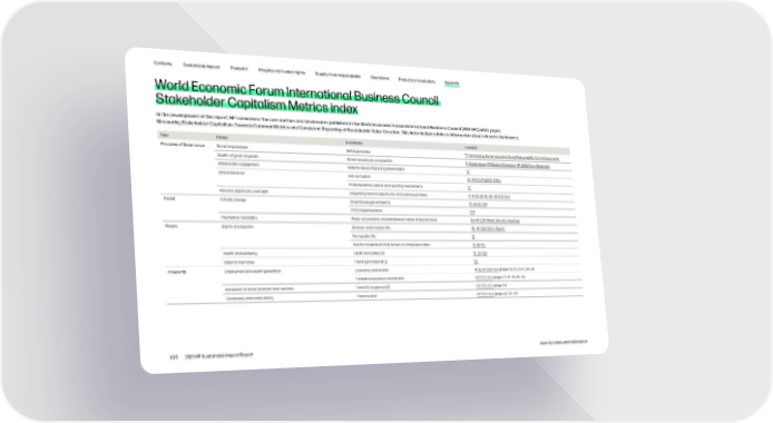 Contents Sustainable Impact Footprint Integrity and human rights Supply chain responsibility Operations Products and solutions Appendix World Economic Forum International Business Council Stakeholder Capitalism Metrics index In the development of this report, HP considered the core metrics and disclosures published in the World Economic Forum International Business Council (WEF IBC) white paper, Measuring Stakeholder Capitalism: Towards Common Metrics and Consistent Reporting of Sustainable Value Creation. This index includes links to information about relevant disclosures. Pillar Theme Sub-theme Location Principles of Governance Governing purpose Setting purpose 11, Nominating, Governance and Social Responsibility Committee charter Quality of governing body Governance body composition 11, Governance, HP Board of Directors, HP 2022 Proxy Statement Stakeholder Engagement Material issues impacting stakeholders 12 Ethical behavior Anti-corruption 22, Anti-Corruption Policy Protected ethics advice and reporting mechanisms 21 Risk and opportunity oversight Integrating risk and opportunity into business process 5, 14, 20, 28, 45, 66, HP 2021 10-K Planet Climate change Greenhouse gas emissions 15, 36, 82, 104 TCFD implementation 104 Freshwater availability Water consumption and withdrawal in water-stressed areas 38, HP CDP Water Security response People Dignity and equality Diversity and inclusion (%) 46, HP 2021 EEO-1 Report Pay equality (%) 51 Risk for incidents of child, forced, or compulsory labor 31, 42, 110 Health and wellbeing Health and safety (%) 51, 53, 109 Skills for the future Training provided (#, $) 50 Prosperity Employment and wealth generation Economic contribution 4, 58, HP 2021 10-K (pages 39, 55, 83–87, 88–91) Financial investment contribution HP 2021 10-K (pages 29, 57–59, 86–90) Innovation of better products and services Total R&D expenses ($) HP 2021 10-K (page 39) Community and social vitality Total tax paid HP 2021 10-K (pages 40, 83–87) 105 2021 HP Sustainable Impact Report www.hp.com/sustainableimpact
